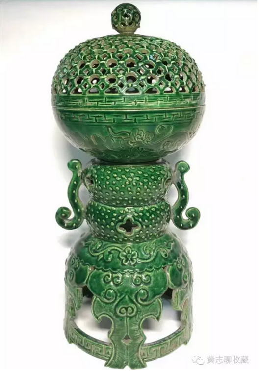 香薰在古代是頗為流行的室內(nèi)陳設(shè)用器,形制多樣,材質(zhì)不一。漢唐時(shí)期出土的香薰眾多,如有名的漢代博山爐,唐代香薰球等。兩宋時(shí)期,實(shí)行文人治國(guó),香具更是盛行,影響所及,同時(shí)并存的遼、金兩朝也頗為風(fēng)行。當(dāng)然,香具中也區(qū)分宅舍用及寺廟用、宮殿用等。其中寺廟及宮殿用品多為成對(duì)擺放,講究對(duì)稱之美,顯得莊重大方。而宅舍之用更為推崇雅致,趣味。下面介紹的這件綠釉香薰應(yīng)為遼金時(shí)期的寺廟用品。 香薰高31.5cm、直徑14.5cm,整體呈豆式。豆是先秦禮器,用以在祭祀、宴饗中盛放肉食。在家廟祭祀中,豆是不可或缺的禮儀用具,早期豆用竹編成,后用青銅鑄造,因此在禮書(shū)中稱“籩豆”。此對(duì)香薰延續(xù)了青銅豆的大體形制,上作球形,香盤(pán)半圓,蓋為鏤空半圓,扣合后渾然如一。香盤(pán)可拆卸,安插于支座上。座上部為雙扁圓狀疊壓,兩側(cè)裝飾螭龍耳;下部呈鏤空裙擺式,承以托泥,穩(wěn)重大方。通體施綠釉,釉面潤(rùn)澤,純凈自然。器身點(diǎn)綴穿花龍紋,如意紋,加之裙擺上的龕形開(kāi)光,推測(cè)為當(dāng)時(shí)高等級(jí)的寺廟的佛前薰香供器。 欣賞更多藏品,歡迎瀏覽【黃志博物館】網(wǎng)站。 我們會(huì)介紹更多的收藏知識(shí)、推薦更多優(yōu)質(zhì)優(yōu)價(jià)的藏品供您了解和選擇,也歡迎您把這些分享給朋友們,讓大家一起來(lái)了解歷史文化、體會(huì)收藏的快樂(lè)!