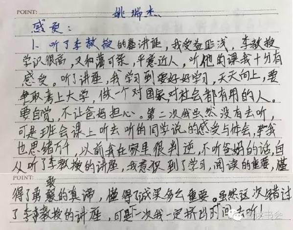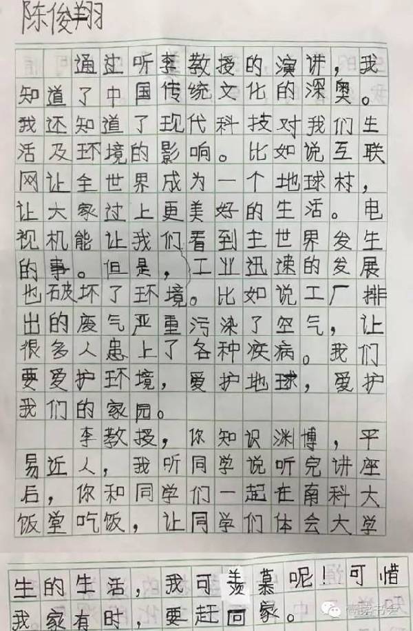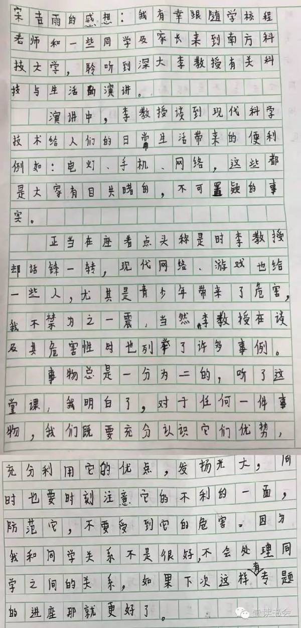近日,多位小朋友特地就這次講座表達(dá)感想。他們紛紛盛贊講座深刻,令其受益匪淺,“深受感動(dòng)”。他們紛紛在感想里提到李教授平易近人,講課精彩,更在聽完李教授的課后開始反思現(xiàn)代科技與當(dāng)代生活,提升自身思想和文化水平。