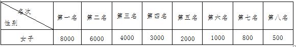 根據(jù)槍聲計時成績錄取女子第一名至第五十名運(yùn)動員現(xiàn)場頒發(fā)獲獎證書,前八名并分別獲得獎金(單位:人民幣元),前三名另外頒發(fā)獎杯一座、完賽獎牌一枚、領(lǐng)獎服裝一套。
