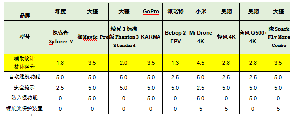總評(píng):小米“Mi Drone 4K”輔助設(shè)計(jì)表現(xiàn)最好,獲評(píng)4.5分。派諾特“Bebop 2 FPV”和零度“探索者Xplorer V”表現(xiàn)較差,僅獲評(píng)1.3分和1.8分。詳見下表。