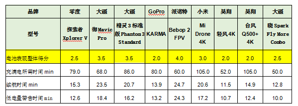 御Mavic Pro”和“精靈3標(biāo)準(zhǔn)版Phantom 3 Standard”,充電時(shí)間較短,續(xù)航時(shí)間較長(zhǎng),表現(xiàn)較好,獲評(píng)3.5分。