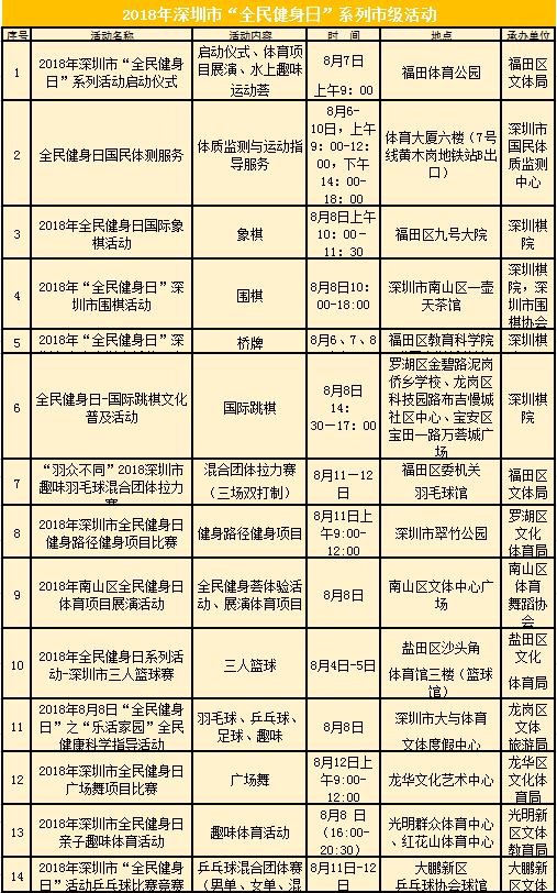????為方便更多群眾加入全民健身隊列,在今年的“全民健身日”,深圳市文體旅游局將在8月4日至12日,在全市開展全民組織開展,其中市級活動14項(xiàng),各區(qū)也將因地制宜對活動進(jìn)行時空拓展。下表為14大市級活動詳情。