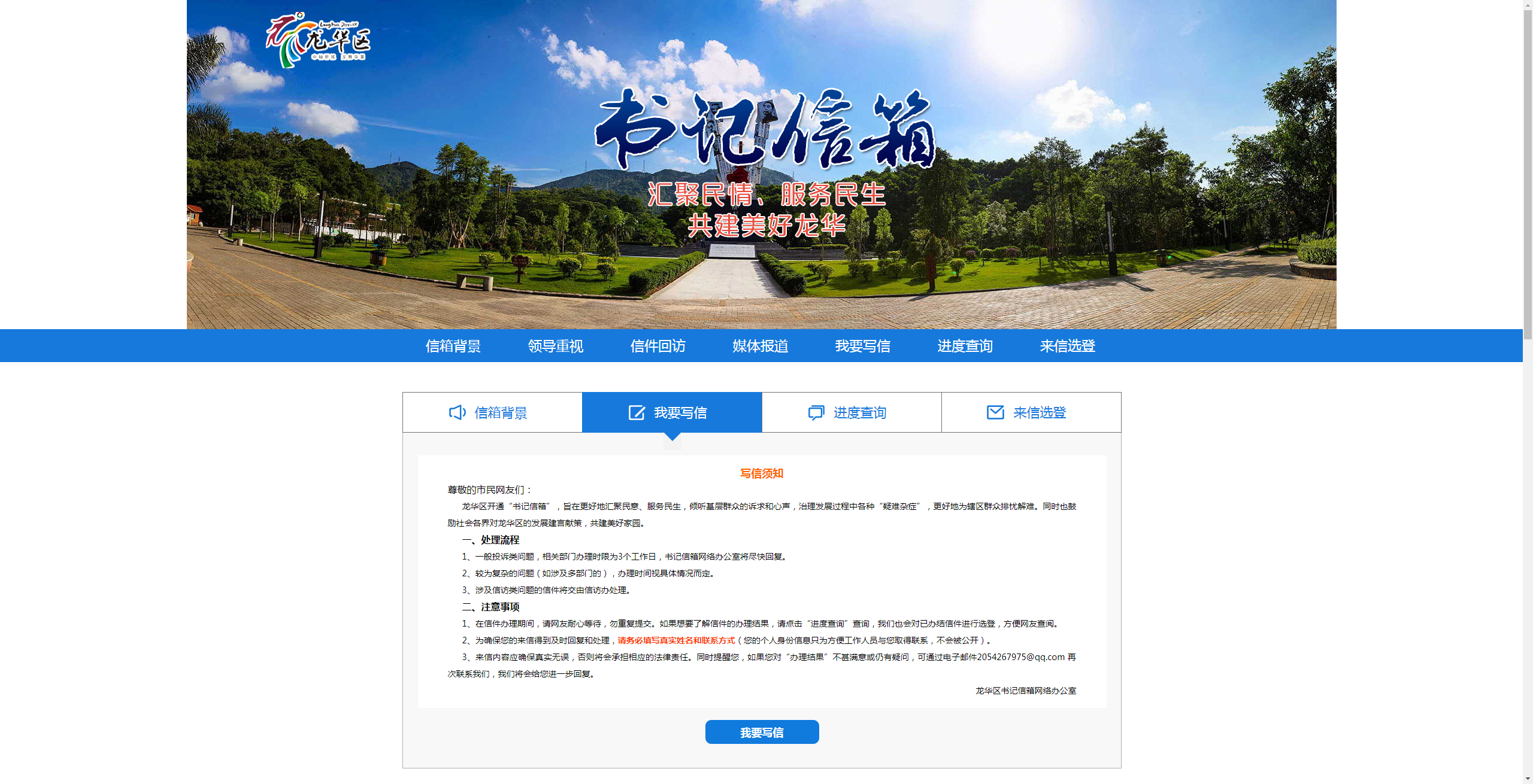 龍華區(qū)“書記信箱”網(wǎng)絡(luò)平臺是由龍華區(qū)領(lǐng)導(dǎo)的指導(dǎo)下搭建的網(wǎng)絡(luò)信息平臺,由深圳新聞網(wǎng)團(tuán)隊(duì)進(jìn)行開發(fā)搭建?!皶浶畔洹钡臉?gòu)建,是龍華區(qū)委貫徹落實(shí)黨的群眾路線,踐行“三嚴(yán)三實(shí)”的一項(xiàng)新舉措?!皶浶畔洹弊?015年10月31日正式上線以來,逐步成為龍華市民向龍華區(qū)委反映、提出建議、意見和投訴請求的重要渠道。