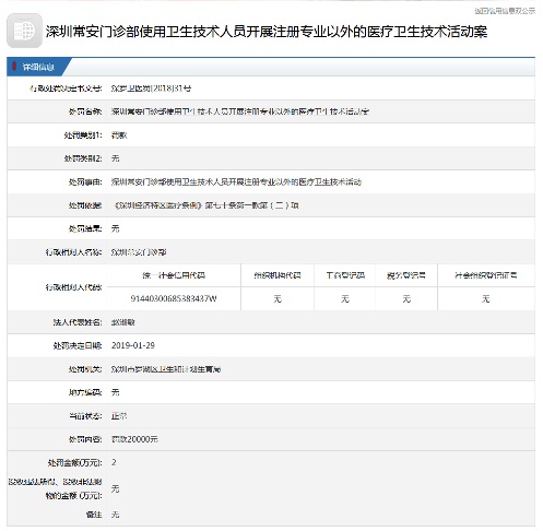 記者從羅湖區(qū)政府在線了解到,1月29日,羅湖區(qū)衛(wèi)生和計劃生育局對市民投訴的門診部已作處罰,處罰事由為,深圳常安門診部使用衛(wèi)生技術(shù)人員開展注冊專業(yè)外的醫(yī)療衛(wèi)生技術(shù)活動,罰款金額為20000元。與此同時,針對市民投訴違規(guī)行醫(yī)的醫(yī)生也作了處罰,處罰理由為,開展注冊專業(yè)以外的醫(yī)療衛(wèi)生技術(shù)活動,罰款金額為5000元。