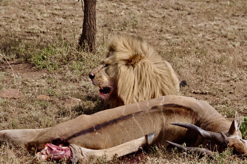 作者運(yùn)氣不錯,在塞倫蓋蒂巡游時巧遇一頭雄獅守護(hù)在一頭被咬死的大羚羊旁。李仁奇 攝