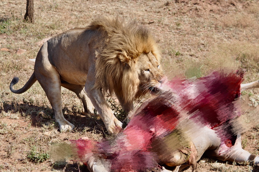 游客們在距雄獅三、五米的車上從容地拍攝了二十多分鐘,記錄下了叢林法則下這場血腥饕餮大餐的全過程。李仁奇 攝