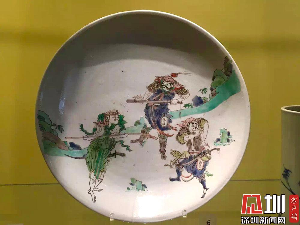 另一款水滸故事粉彩盤上,三個人物都有姓名,分別是:楊雄、解珍、阮小七。