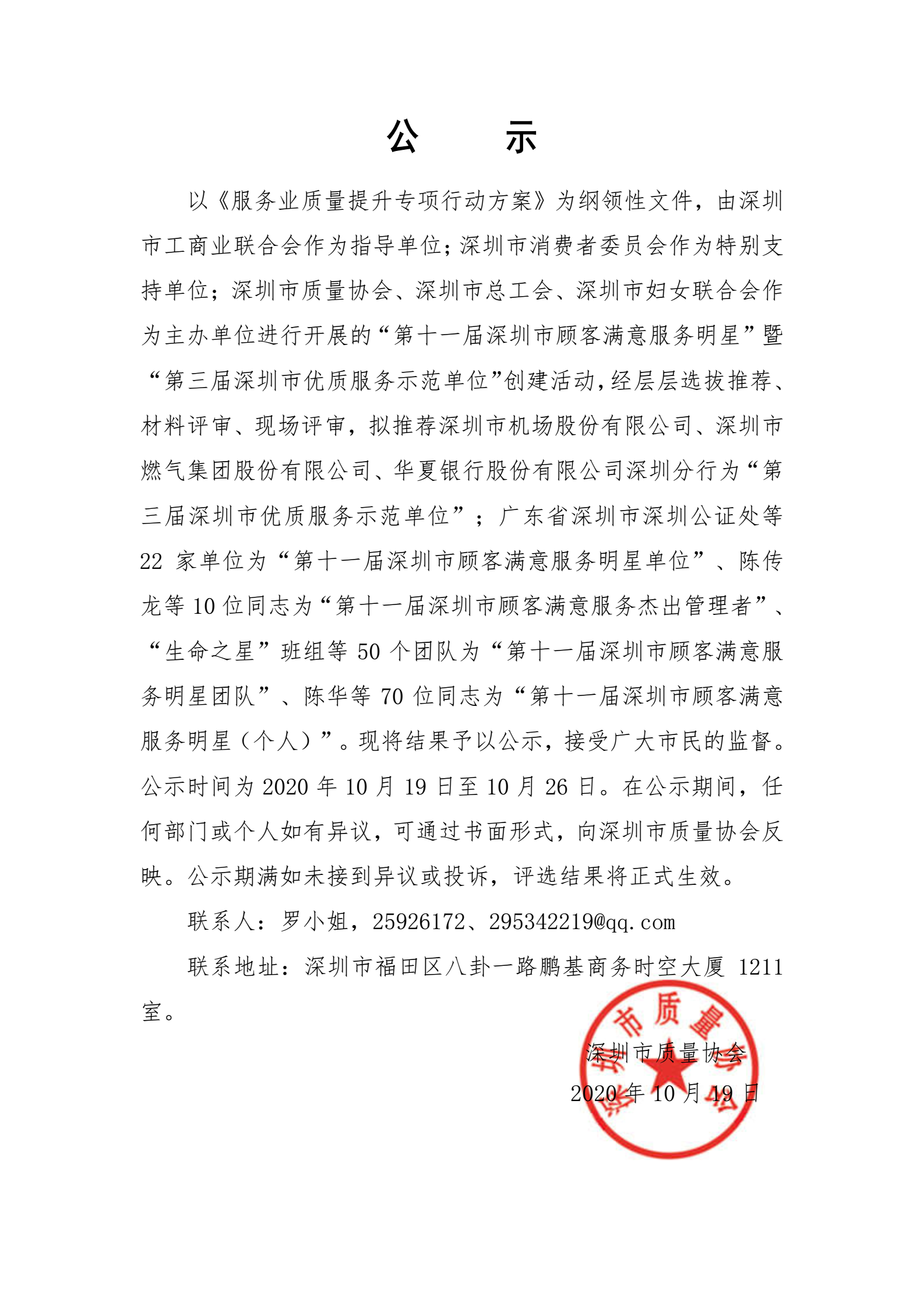 暨“第三屆深圳市優(yōu)質(zhì)服務(wù)示范單位”公示名單