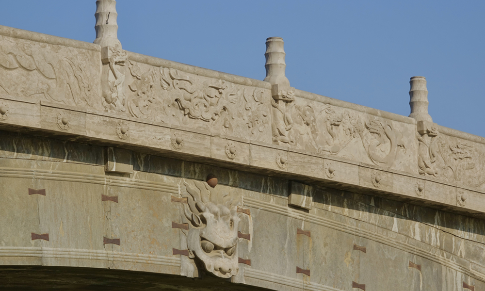 此次修繕在全面測量的基礎(chǔ)上采用原來的護(hù)拱石、鉤石、腰鐵、鐵拉桿和收分五種做法,還在橋面上下加設(shè)了二粘三油防水層(二層防水亞麻布和三層瀝青),防止漏水腐蝕現(xiàn)象發(fā)生。橋面的所有欄板、望術(shù)按早期式樣新制。李仁奇 攝