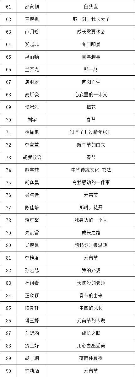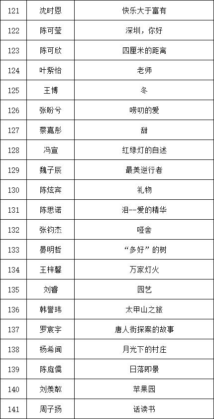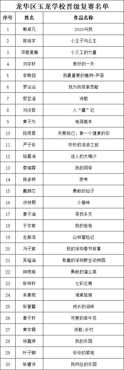 自2021年1月,活動(dòng)征稿啟動(dòng)以來,獲得了深圳市廣大中小學(xué)生、教師、文學(xué)愛好者的熱烈響應(yīng)積極參與,吸引了深圳百余所學(xué)校的上萬人關(guān)注報(bào)名?,F(xiàn)公布龍華區(qū)玉龍學(xué)校專場晉級復(fù)賽名單如下: