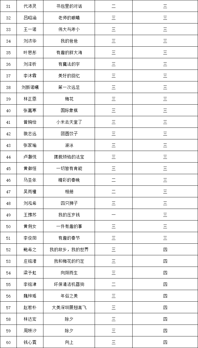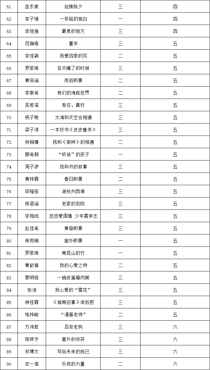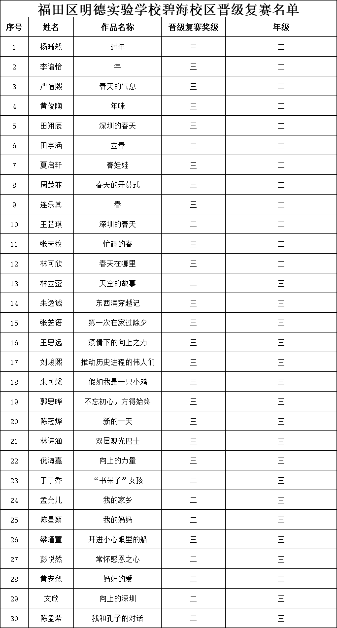 自2021年1月,活動征稿啟動以來,獲得了深圳市廣大中小學(xué)生、教師、文學(xué)愛好者的熱烈響應(yīng)積極參與,吸引了深圳百余所學(xué)校的上萬人關(guān)注報名。現(xiàn)公布福田區(qū)明德實驗學(xué)校碧海校區(qū)專場晉級復(fù)賽名單如下: