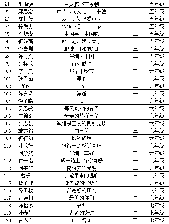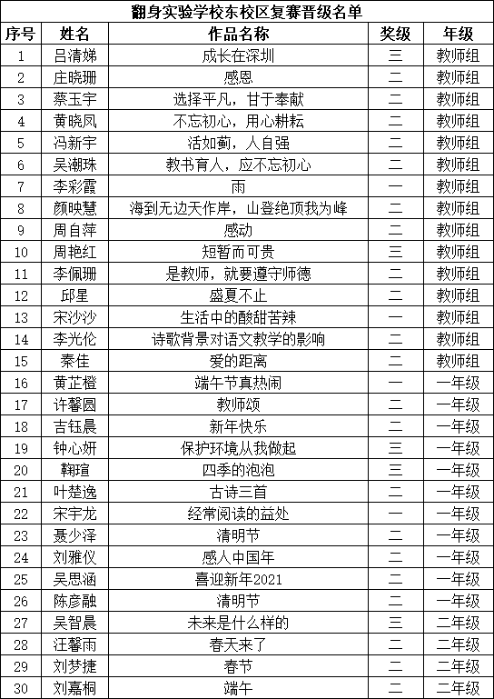自2021年1月,活動征稿啟動以來,獲得了深圳市廣大中小學(xué)生、教師、文學(xué)愛好者的熱烈響應(yīng)積極參與,吸引了深圳百余所學(xué)校的上萬人關(guān)注報名。現(xiàn)公布寶安區(qū)翻身實驗學(xué)校(東校區(qū))晉級復(fù)賽名單如下: