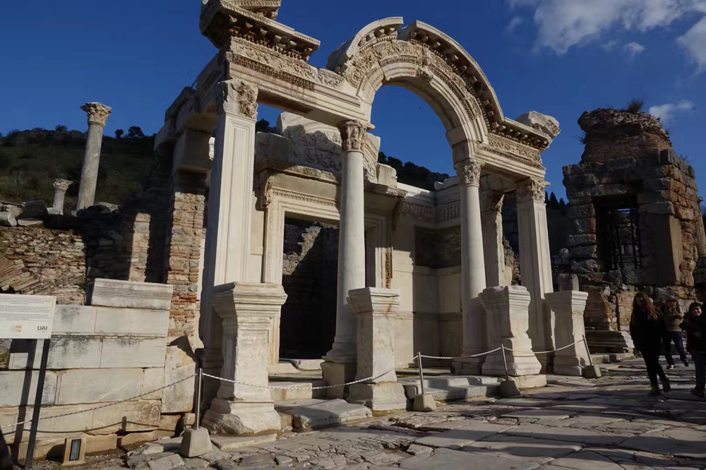 哈德良神廟就在圖書館斜對面,是典型柯林斯式神廟的代表,內(nèi)墻廊柱上有不同神話人物的雕刻,拱門上有精美的浮雕,前側(cè)拱門上是幸運(yùn)女神的頭像,內(nèi)側(cè)拱門上是張開雙臂的蛇發(fā)女妖美杜莎的雕像。李仁奇 攝