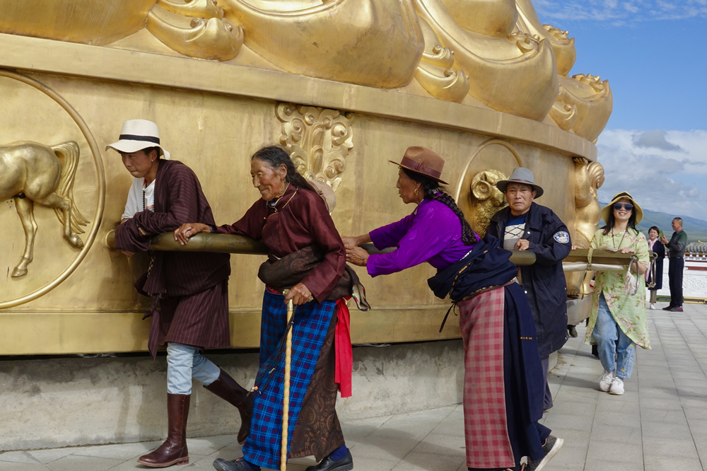 按照藏傳佛教的說法,大轉經(jīng)筒上面刻的經(jīng)咒和里面裝的經(jīng)咒比小轉經(jīng)筒要多,轉一圈劃過的軌跡比小轉經(jīng)筒大得多,積累的功德也高得多。李仁奇 攝