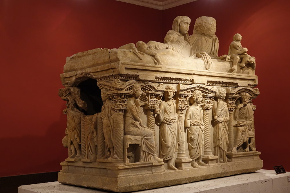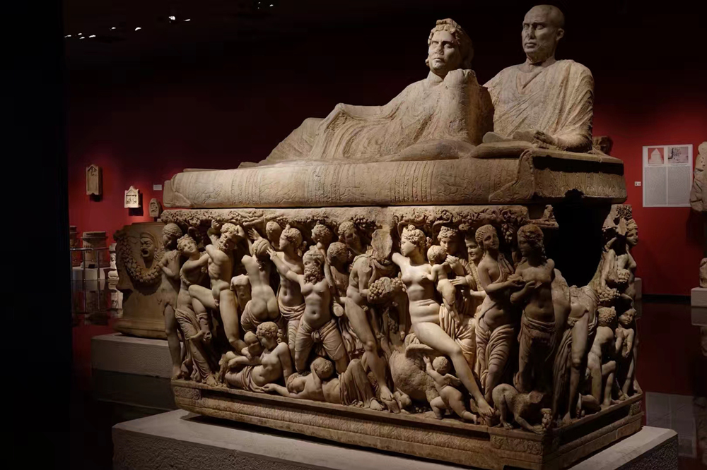 赫拉克勒斯石棺,它的側(cè)立面描繪赫拉克勒斯斬殺九頭蛇、與獅子搏斗、偷盜金蘋(píng)果等12項(xiàng)苦力后升為神的傳奇故事,浮雕保存完整、栩栩如生,展現(xiàn)了古羅馬精湛的雕塑工藝。李仁奇 攝