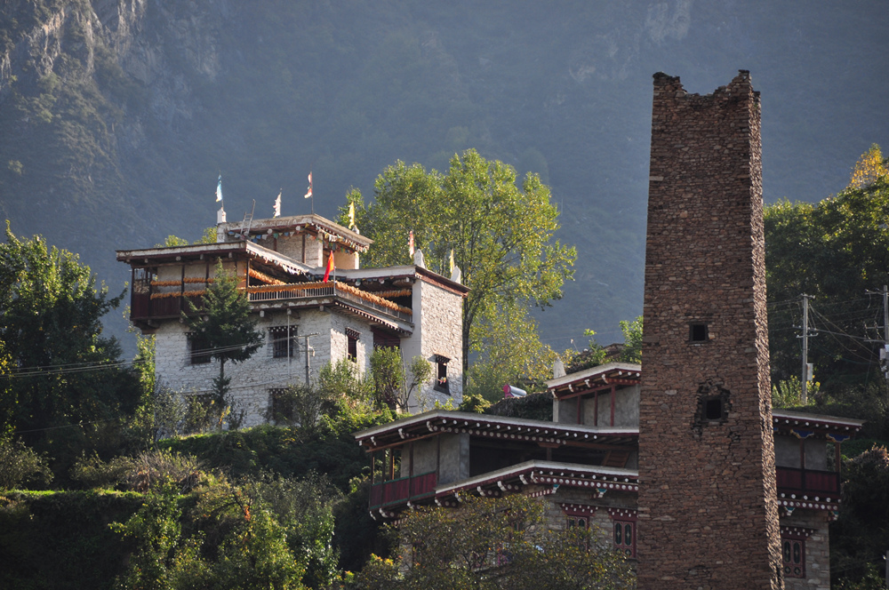 古碉為片石或石塊夾泥砌成,棱角筆直,墻面光滑,下寬上窄,一般高20余米,最高達50米,內(nèi)建樓層十余層至二十余層,每層可容納10余人。李仁奇 攝