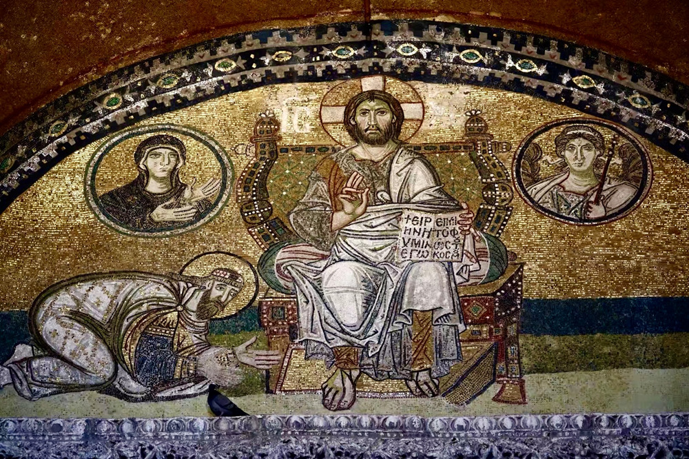 鑲嵌畫《全能的耶穌》。坐在寶座上的耶穌左手握著福音書,上面用希臘文寫著:“賜予汝和平,我世界之光”。耶穌左邊是圣母瑪利亞,右邊是大天使,當(dāng)時的羅馬皇帝虔誠的匍匐在耶穌面前。李仁奇 攝