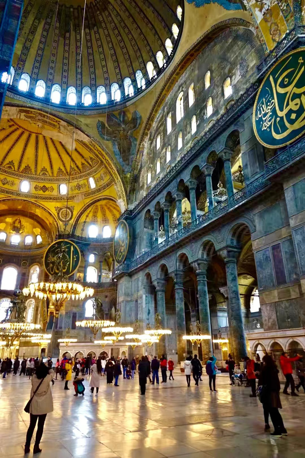 大堂里懸掛著巨大的金字圓牌,上面刻寫著真主、先知默罕默德、前四位哈里發(fā)以及穆罕默德兩個孫子的名字,出自奧斯曼詩人兼書法家厄芬迪的手筆,至今仍然吸引著游客們的目光。李仁奇 攝
