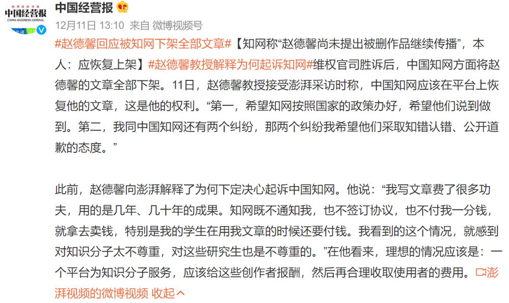 12月10日,中國(guó)知網(wǎng)向趙德鑫教授道歉,表示將妥當(dāng)處理趙德鑫教授作品繼續(xù)在知網(wǎng)平臺(tái)傳播的問(wèn)題。道歉中提到,2016年起,中國(guó)知網(wǎng)向全社會(huì)免費(fèi)開(kāi)放八年前出版的文獻(xiàn),未來(lái)將進(jìn)一步免費(fèi)開(kāi)放更多的學(xué)術(shù)資源。2019年起,所有在中國(guó)知網(wǎng)實(shí)名注冊(cè)的作者,可無(wú)限期免費(fèi)使用自己的作品,管理自己的學(xué)術(shù)成果,并隨時(shí)跟蹤其研究成果的學(xué)術(shù)影響。