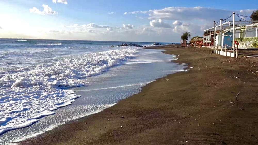 黑沙灘是圣托里尼有名的礦物沙灘,在旅游旺季時(shí)游人非常多。這里的沙灘其實(shí)是火山噴發(fā)后的火山灰沉積下來的小沙石,經(jīng)過長(zhǎng)期的風(fēng)化形成了如今的黑沙灘。李仁奇 攝