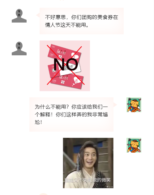 遇到春節(jié)、情人節(jié)等特殊時期,消費者在團購時應(yīng)當(dāng)看清使用期限,如商家未提前說明美食券的限用日期,而是去到現(xiàn)場才告知消費者不能使用,則商家涉嫌侵害消費者的知情權(quán)、公平交易權(quán)。如商家銷售美食券的頁面,注明情人節(jié)不能使用,此時商家盡到了提醒義務(wù),消費者可在規(guī)定的其他時間內(nèi)使用美食券,或者向平臺申請退款。(消費提示:消費者購買團購券時,要仔細閱讀團購頁面的使用說明,特別是要仔細瀏覽團購券使用時限。限用人數(shù)等具體內(nèi)容,避免遭遇買了卻用不了的困境。)