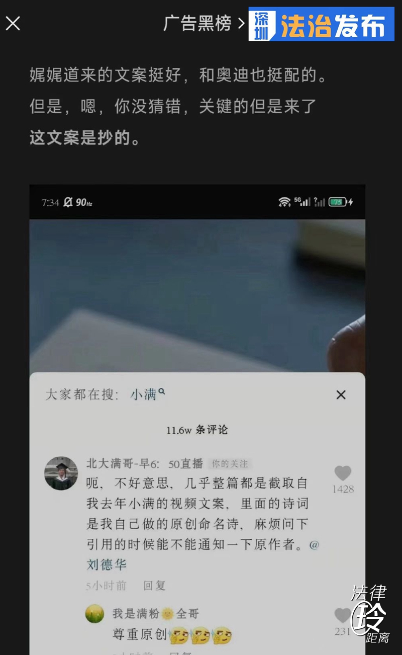 讀特客戶端·深圳新聞網(wǎng)2022年5月24日訊(記者 張玲 翁任瑩 實(shí)習(xí)生 趙薇)5月21日是中國(guó)24節(jié)氣的小滿,奧迪公司一則小滿廣告迅速成為刷屏爆款。在這條名為《今日小滿,人生小滿就好》的廣告短片中,出鏡代言人是劉德華,他用娓娓道來(lái)的口吻說(shuō)著“小滿代表了一種人生態(tài)度……”然而,不到1天的時(shí)間,奧迪小滿廣告就深陷文案抄襲風(fēng)波,博主“北大滿哥”指出這部短片幾乎全文抄了自己去年發(fā)布的小滿視頻文案。