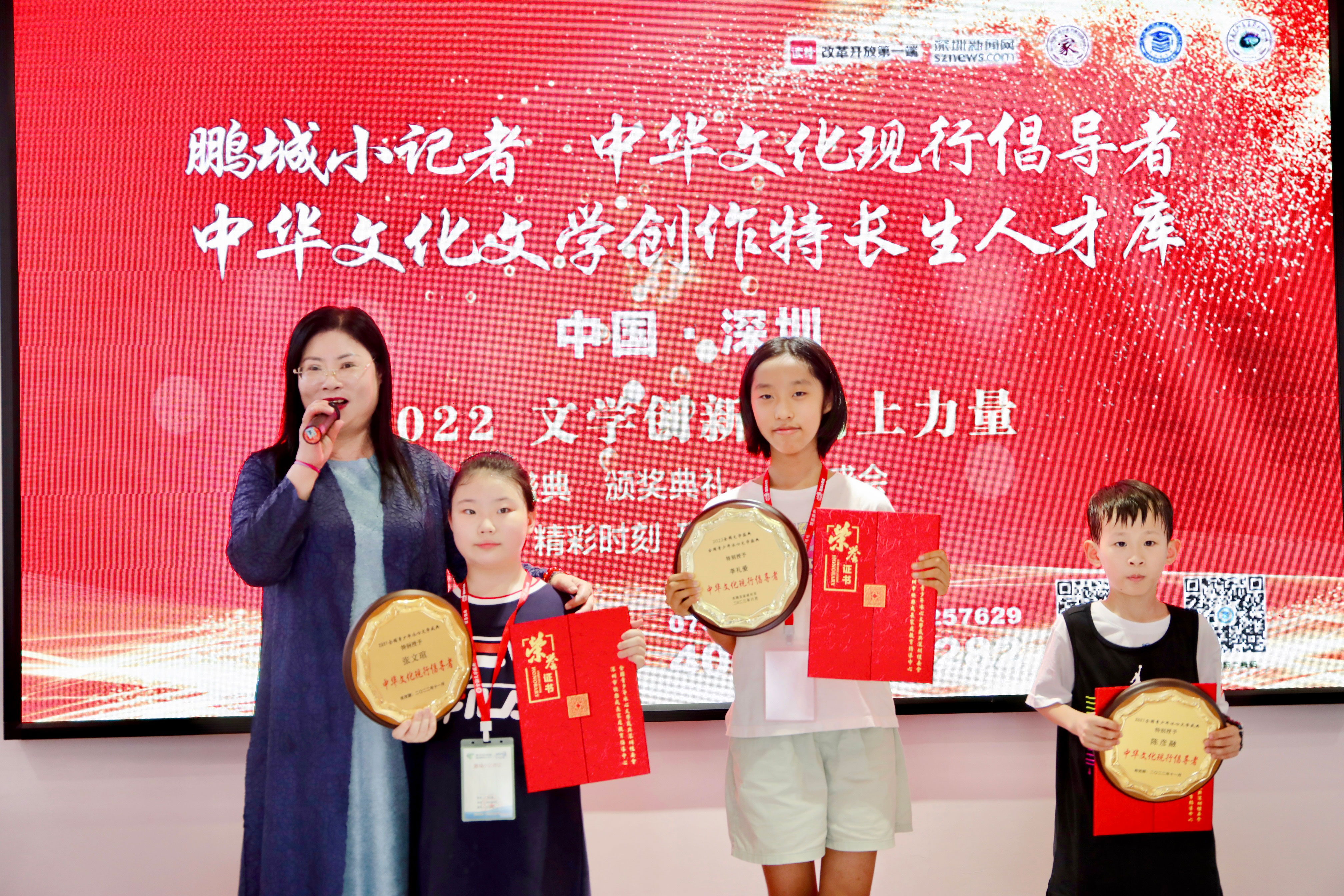 “中華文化現(xiàn)行倡導(dǎo)者”“中華文化文學(xué)特長生人才庫”和“鵬城小記者”的優(yōu)生代表與頒獎嘉賓合影留念