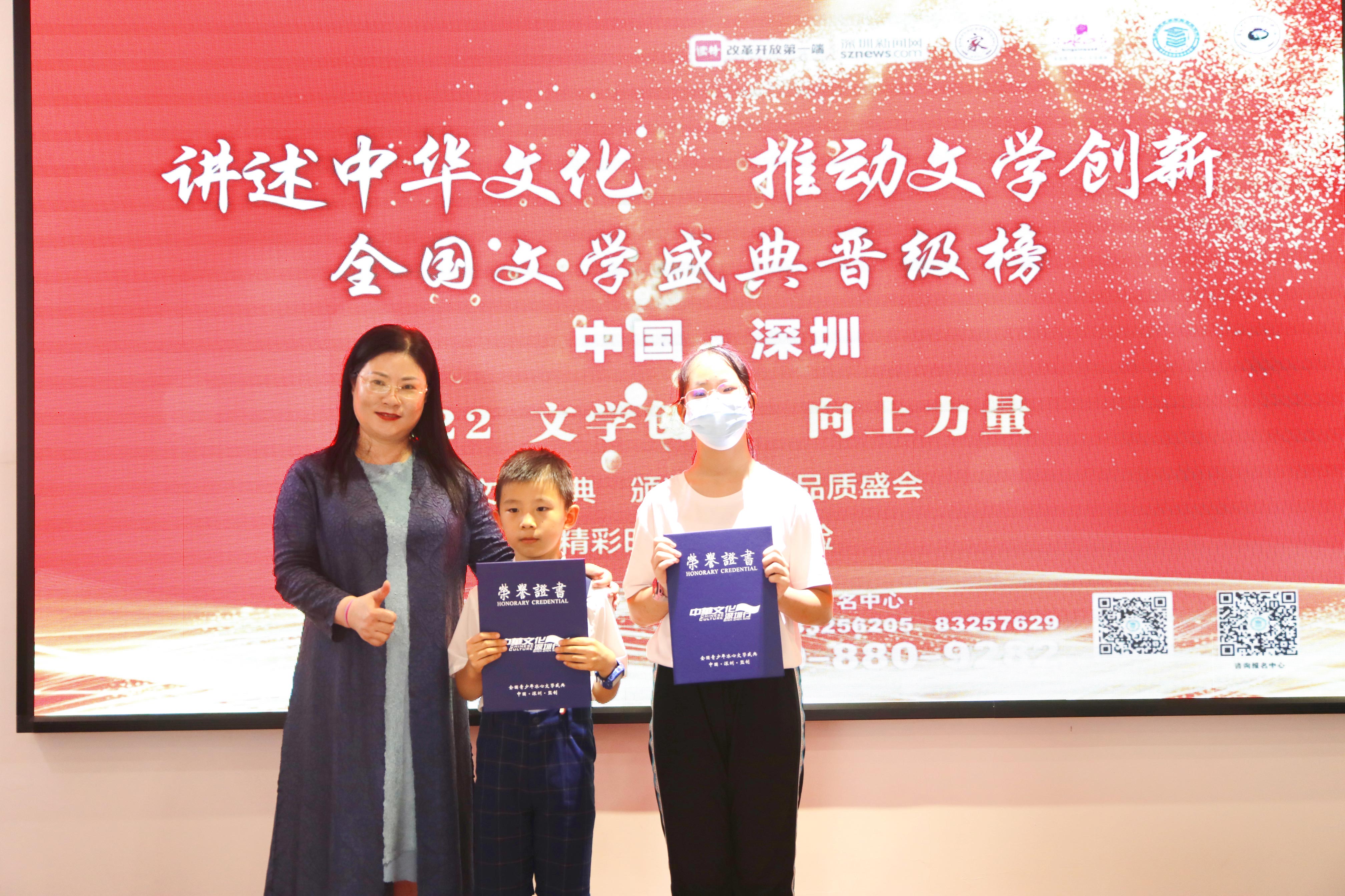 全國文學(xué)盛典聯(lián)合發(fā)起人、創(chuàng)始人肖硯寧為優(yōu)生代表頒獎(jiǎng)并合影