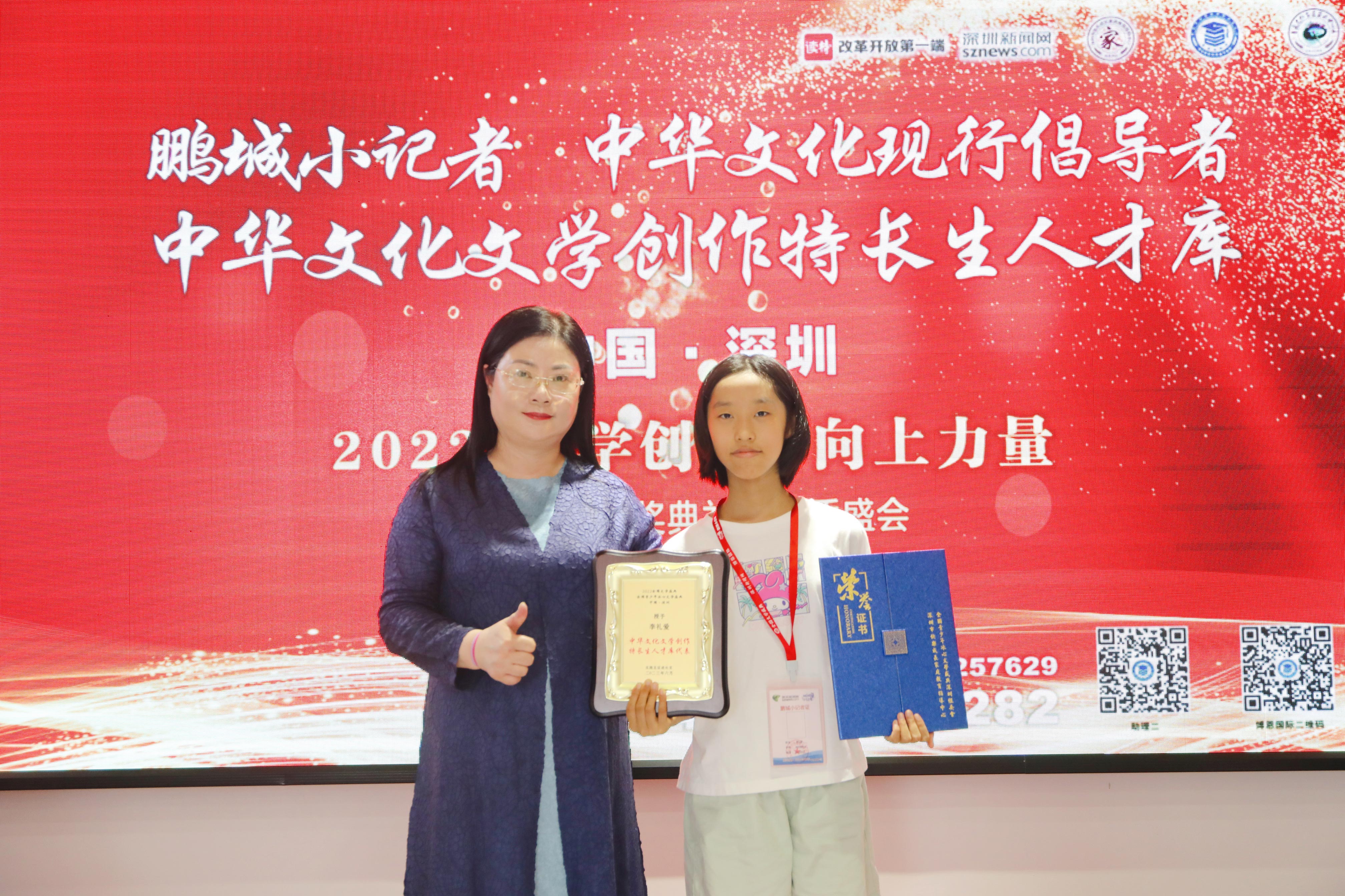 全國文學(xué)盛典聯(lián)合發(fā)起人、創(chuàng)始人肖硯寧與獲獎學(xué)生李禮愛合影