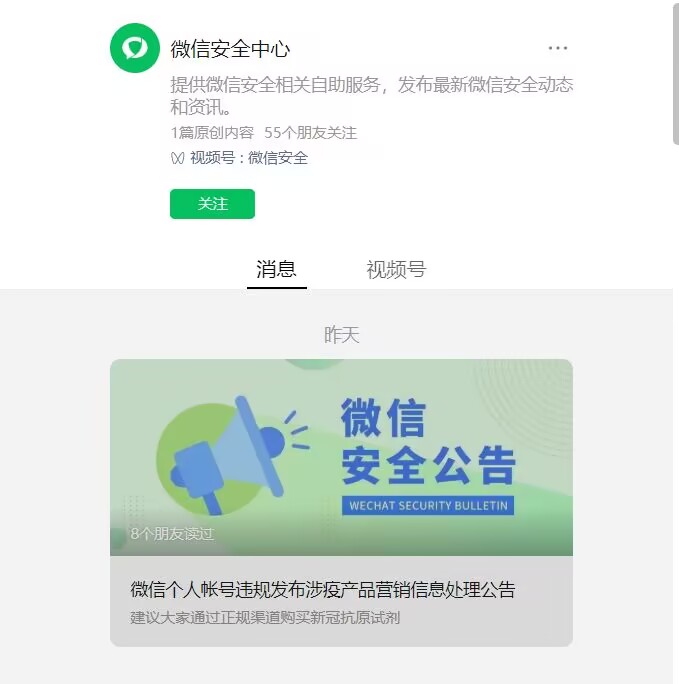 公告強(qiáng)調(diào),“利用微信個(gè)人帳號發(fā)布抗原檢測試劑、藥品等營銷信息的行為,違反了相關(guān)法律法規(guī),也違反了《微信個(gè)人帳號使用規(guī)范》,微信安全團(tuán)隊(duì)將對違法違規(guī)行為進(jìn)行堅(jiān)決處理、嚴(yán)厲打擊。”