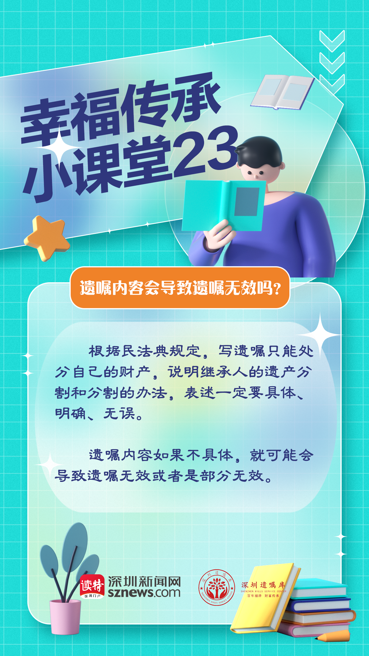 今天,由深圳遺囑庫與深圳新聞網聯(lián)合制作的幸福傳承小課堂第23期,我們就來說說,遺囑什么情況下可能無效。根據(jù)民法典規(guī)定,寫遺囑只能處分自己的財產,說明繼承人的遺產分割和分割的辦法,表述一定要具體、明確、無誤。遺囑內容如果不具體,就可能會導致遺囑無效或者是部分無效。因此,李大爺不能將財產的全部都給到后老伴,法院也判定了這份遺囑是部分無效的。