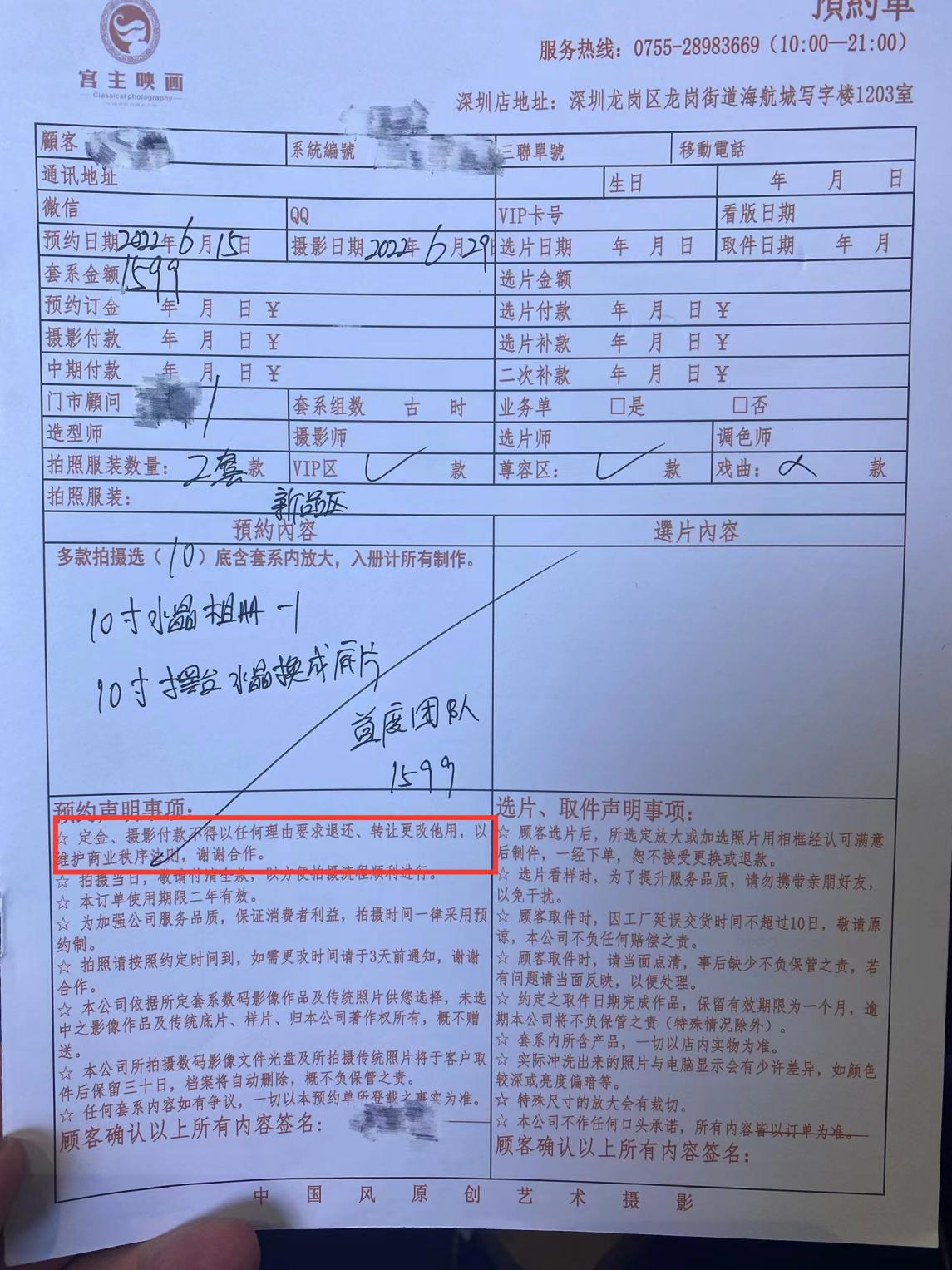 本人于2022年6月15日在該商家處支付了1599元購(gòu)買寫真拍攝服務(wù),購(gòu)買后因故離開(kāi)深圳,無(wú)法繼續(xù)消費(fèi),故要求退還預(yù)付款。