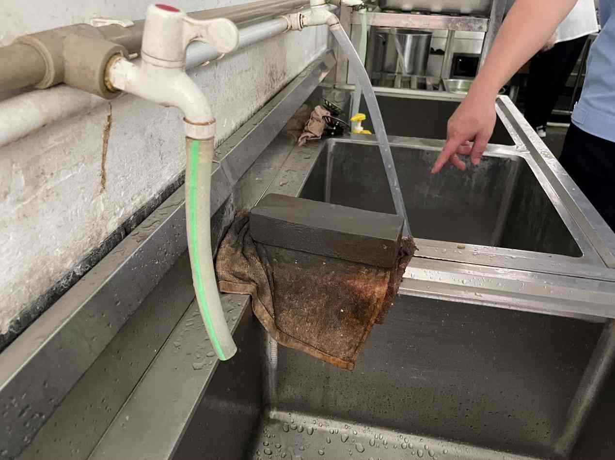 但在檢查中,執(zhí)法人員也發(fā)現了不少的問題。在粗加工區(qū),執(zhí)法人員發(fā)現蔬菜清洗池旁邊有一塊潔凈程度較差的磨刀石,要求食堂負責人將其清潔后移放別處,以防止對食材產生污染。進入烹飪區(qū),執(zhí)法人員對食堂員工進行了手部檢查,發(fā)現員工指甲偏長,要求盡快剪除。同時,執(zhí)法人員發(fā)現烹飪區(qū)缺少燈具,光線較為昏暗,若鍋中有異物難以發(fā)現,建議食堂負責人盡快安裝燈具。而在烹飪區(qū)的地面,執(zhí)法人員在排水渠盡頭發(fā)現了一個未加遮掩的大洞,執(zhí)法人員表示,這樣的大洞極容易造成老鼠、蟑螂等生物的入侵,要求食堂負責人盡快對此問題進行整改。