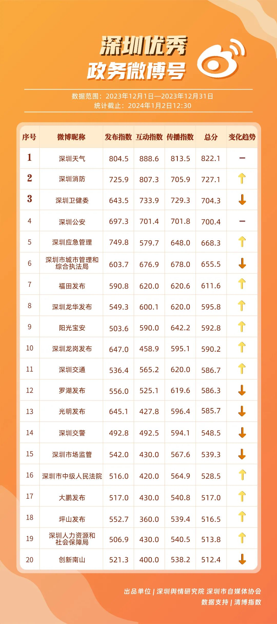 據(jù)悉,《深圳優(yōu)秀政務(wù)新媒體矩陣》由深圳輿情研究院、深圳市自媒體協(xié)會聯(lián)合推出,旨在通過對深圳黨政機關(guān)、企事業(yè)單位開設(shè)的政務(wù)新媒體進(jìn)行持續(xù)觀察、定期評估,展現(xiàn)政務(wù)新媒體的建設(shè)管理水平及公眾認(rèn)可度,同時發(fā)揮好媒體的宣傳監(jiān)督作用,推動政務(wù)新媒體矩陣規(guī)范有序發(fā)展。