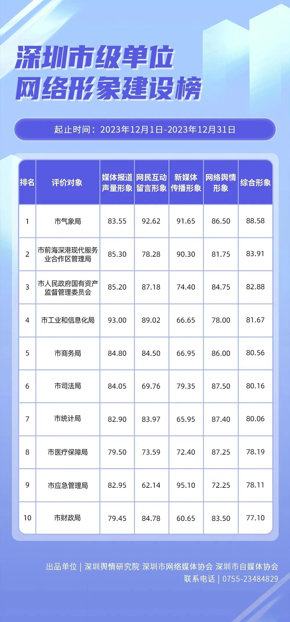 在《深圳市級(jí)單位網(wǎng)絡(luò)形象建設(shè)榜》中,市氣象局、市前海深港現(xiàn)代服務(wù)業(yè)合作區(qū)管理局、市人民政府國(guó)有資產(chǎn)監(jiān)督管理委員會(huì)、市工業(yè)和信息化局、市商務(wù)局、市司法局、市統(tǒng)計(jì)局、市醫(yī)療保障局、市應(yīng)急管理局、市財(cái)政局依次上榜。榜單顯示,有超半數(shù)單位綜合形象得分在80分以上。其中,有3個(gè)單位新媒體傳播形象得分在95分以上;5個(gè)單位網(wǎng)絡(luò)輿情形象得分在85分以上,另有多個(gè)單位媒體報(bào)道聲量形象、網(wǎng)民互動(dòng)留言聲量形象得分在80分以上,展現(xiàn)出上榜單位綜合實(shí)力較強(qiáng)、單項(xiàng)優(yōu)勢(shì)突出的特點(diǎn)。