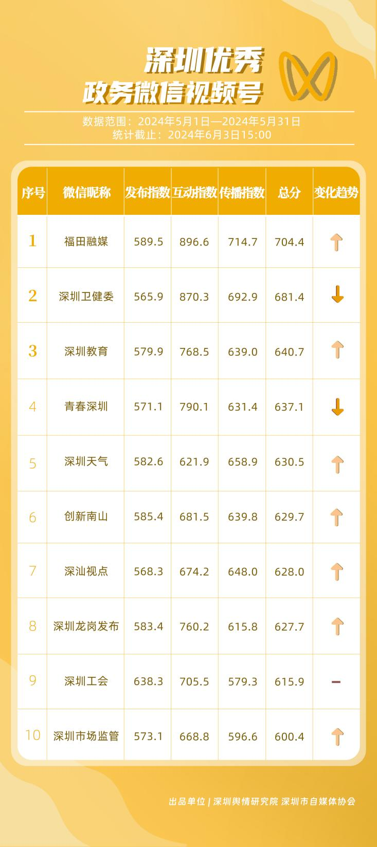 5月,“深圳衛(wèi)健委”“深圳龍崗發(fā)布”“i深圳”“幸福福田”“深圳交通”“深圳工會”“青春深圳”“羅湖發(fā)布”“深圳應(yīng)急管理”“深圳教育”等30個政務(wù)微信公眾號,被評為“深圳優(yōu)秀政務(wù)微信公眾號”。5月,“深圳衛(wèi)健委”憑借精心創(chuàng)作的內(nèi)容、與受眾深入互動,多篇作品深受好評,榮登榜單首位?!吧钲邶垗彴l(fā)布”“i深圳”“幸福福田”“深圳交通”等上榜公眾號也積極捕捉觀眾優(yōu)質(zhì)作品需求,把握主流熱點趨勢,集中發(fā)揮政務(wù)媒體傳播力量,在本期也取得了較為亮眼的成績,進一步推動了政務(wù)信息傳播工作提質(zhì)增效。