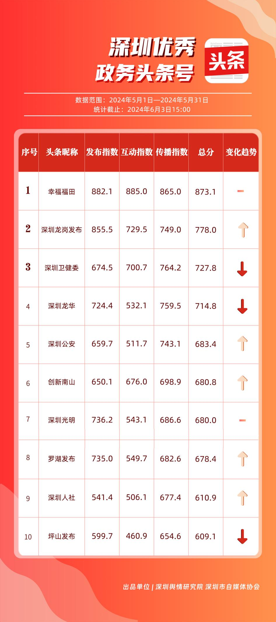 5月,“幸福福田”“深圳龍崗發(fā)布”“深圳衛(wèi)健委”“深圳龍華”“深圳公安”“創(chuàng)新南山”“深圳光明”“羅湖發(fā)布”“深圳人社”“坪山發(fā)布”共10個政務(wù)頭條號能夠及時發(fā)布政務(wù)信息及公共服務(wù)信息,服務(wù)經(jīng)濟社會發(fā)展,滿足公眾信息需求,位列“優(yōu)秀政務(wù)頭條號”榜單,《廣東人將挑戰(zhàn)暴雨上班30天》《幫朋友問:“口~”會不會傳染艾滋???》等優(yōu)秀文章資訊深入人心。其他未上榜單位應(yīng)積極運用該新媒體平臺助力政務(wù)公開,讓權(quán)威聲音有效傳播到目標(biāo)受眾,更好地服務(wù)人民群眾。