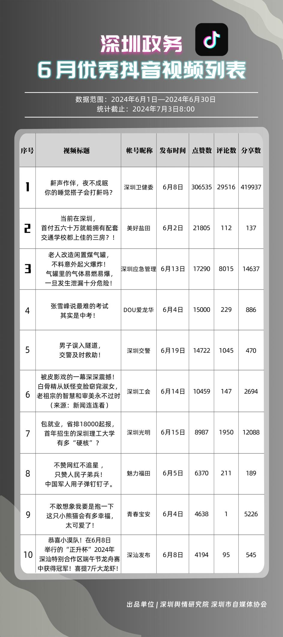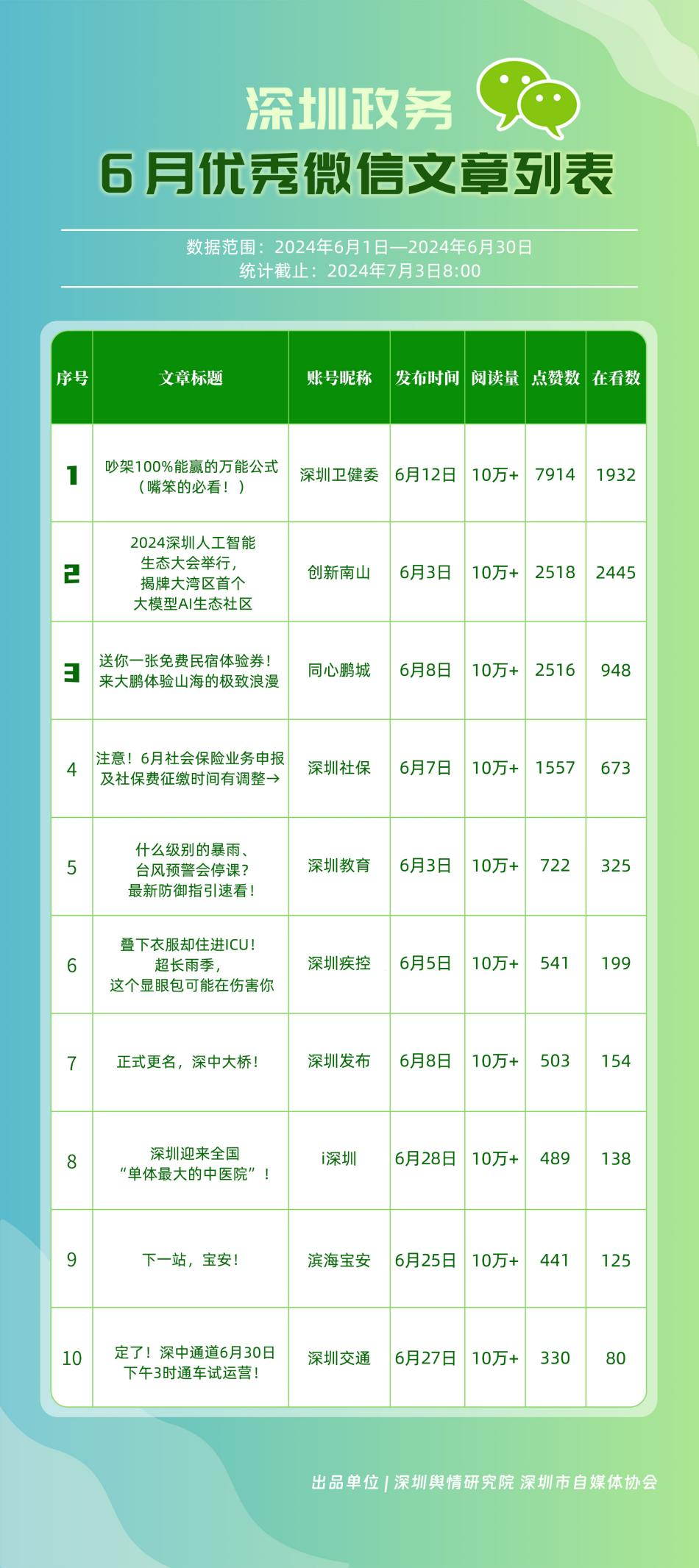 6月,“深圳衛(wèi)健委”“i深圳”“深圳龍崗發(fā)布”“幸福福田”“深圳交通”“深圳教育”“濱海寶安”“創(chuàng)新南山”“深圳工會”“青春深圳”“同心鵬城”“深圳光明”等30個政務(wù)微信公眾號,被評為“深圳優(yōu)秀政務(wù)微信公眾號”。6月,“深圳衛(wèi)健委”因內(nèi)容策劃出色、受眾互動活躍、作品火熱“出圈”等,榮登排行榜首位。“創(chuàng)新南山”“同心鵬城”“深圳社?!薄吧钲诮逃钡壬习窆娞栆卜e極創(chuàng)作優(yōu)質(zhì)作品,抓住時下熱點趨勢,集中發(fā)揮政務(wù)媒體傳播力量,推動了政務(wù)信息傳播工作提質(zhì)增效。