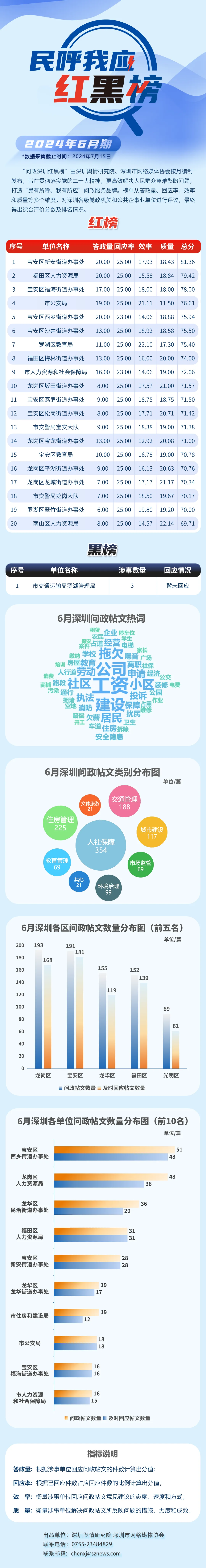 2024年6月,共有20家單位因積極解決民生問題,認真細致答政,登上“紅榜”,它們分別是:寶安區(qū)新安街道辦事處、福田區(qū)人力資源局、寶安區(qū)福海街道辦事處、市公安局、寶安區(qū)西鄉(xiāng)街道辦事處、寶安區(qū)沙井街道辦事處、羅湖區(qū)教育局、福田區(qū)梅林街道辦事處、市人力資源和社會保障局、龍崗區(qū)坂田街道辦事處、寶安區(qū)燕羅街道辦事處、寶安區(qū)松崗街道辦事處、市交警局寶安大隊、龍崗區(qū)寶龍街道辦事處、寶安區(qū)教育局、龍崗區(qū)平湖街道辦事處、龍崗區(qū)龍城街道辦事處、市交警局龍崗大隊、羅湖區(qū)翠竹街道辦事處、南山區(qū)人力資源局。另外,市交通運輸局羅湖管理局因相關(guān)帖文回應(yīng)率偏低,整體答政效果不佳,被列入“黑榜”。