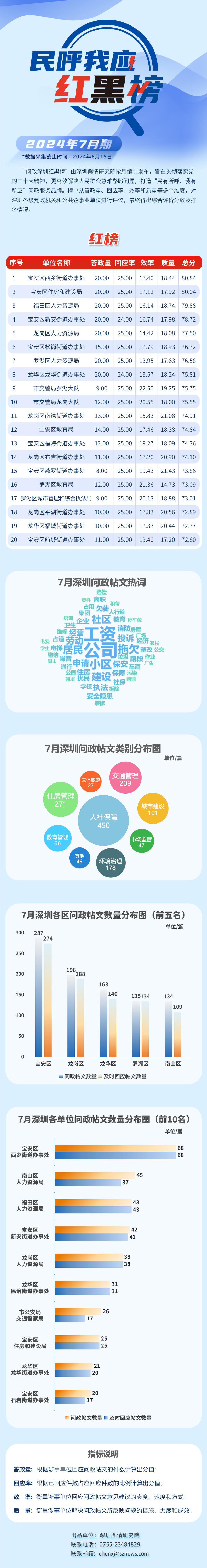 本期榜單采集的帖文主要來自深圳市及各區(qū)政府官網、深圳論壇、人民網領導留言板、深圳新聞網“民呼我應”等平臺,所采集帖文發(fā)布時間為2024年7月1日至7月31日,采集截止時間為2024年8月15日。