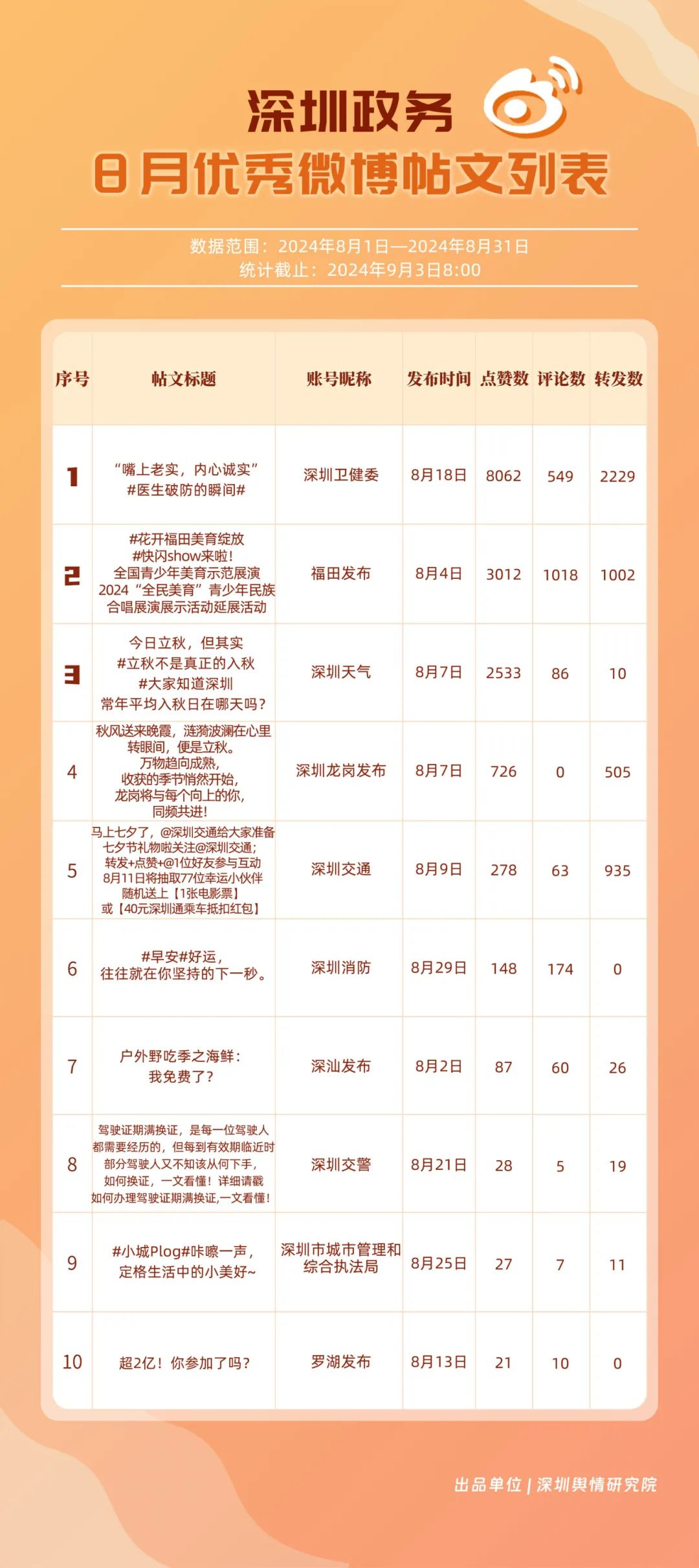 8月,“深圳天氣”“深圳衛(wèi)健委”“深圳消防”“福田發(fā)布”“深圳交警”“深圳龍崗發(fā)布”“深圳應急管理”“深圳公安”“深圳交通”“深圳市城市管理和綜合執(zhí)法局”等20個政務微博號發(fā)布高質量信息,入選優(yōu)秀政務微博號。其中,“深圳天氣”“深圳衛(wèi)健委”持續(xù)保持領先地位;“深圳消防”“福田發(fā)布”“深圳交警”等賬號有效優(yōu)化發(fā)布內容和互動策略,排名有所提升。