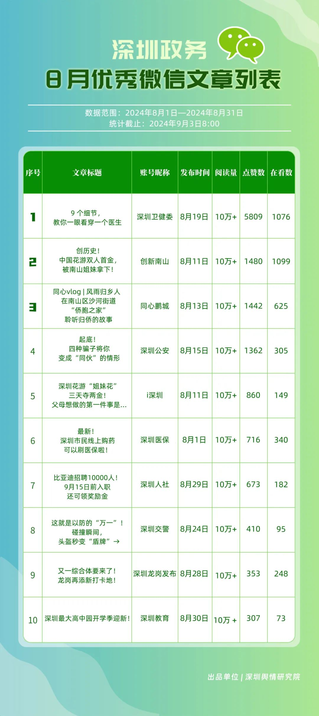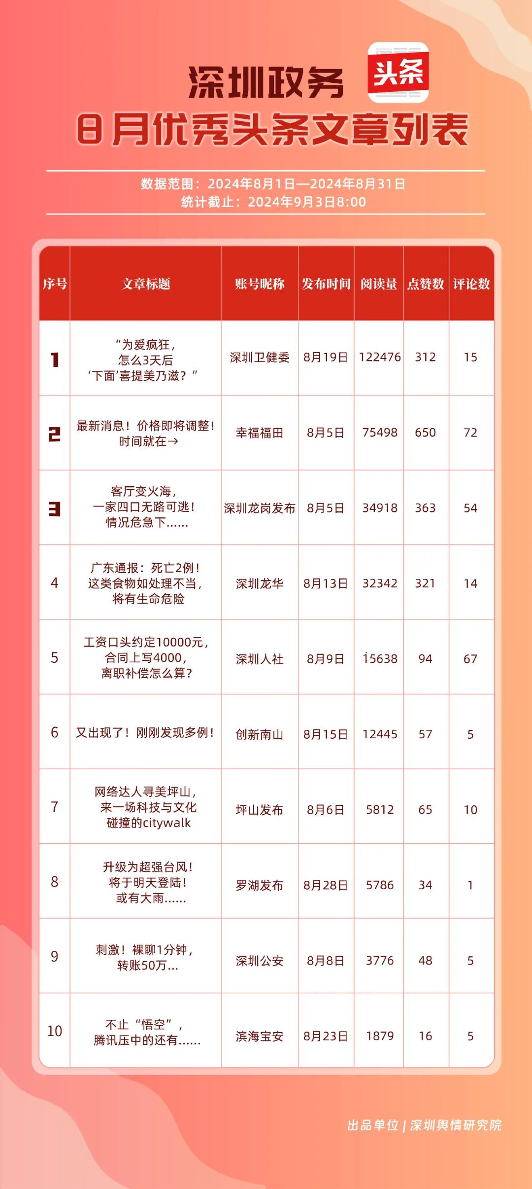 8月,“幸福福田”“深圳龍崗發(fā)布”“深圳衛(wèi)健委”“深圳龍華”“創(chuàng)新南山”“深圳人社”“深圳光明”“羅湖發(fā)布”“濱海寶安”和“坪山發(fā)布”共10個政務(wù)頭條號入選榜單。相關(guān)賬號的文章《“為愛瘋狂,怎么3天后‘下面’喜提美乃滋?”》《最新消息!價格即將調(diào)整!時間就在→》等貼近民生,傳遞實用信息,收獲了較高的閱讀量和點(diǎn)贊數(shù)。