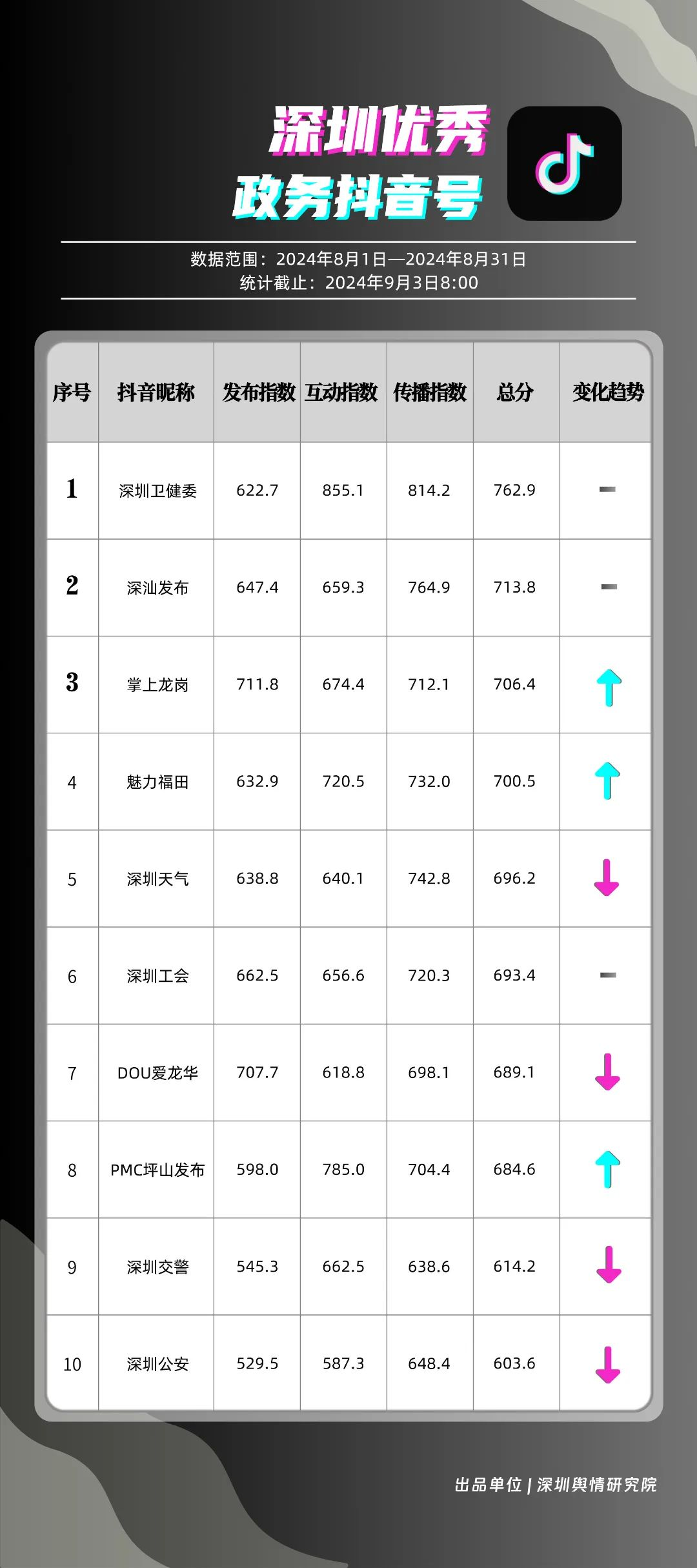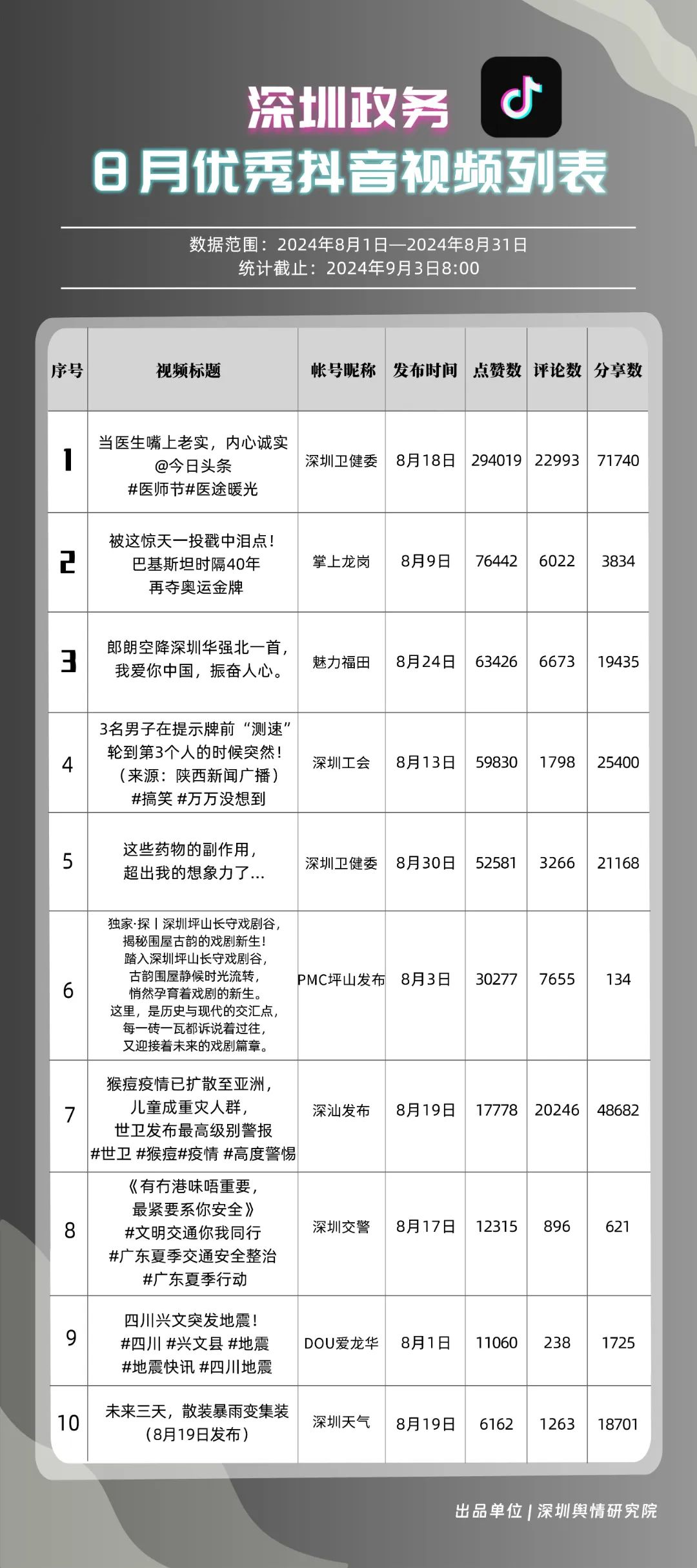 8月,“深圳衛(wèi)健委”“深汕發(fā)布”“掌上龍崗”“魅力福田”“深圳天氣”“深圳工會”“DOU愛龍華”“PMC坪山發(fā)布”“深圳交警”和“深圳公安”共10個政務(wù)抖音號獲得優(yōu)秀稱號,“深圳衛(wèi)健委”“深汕發(fā)布”“掌上龍崗”以高分居榜單前三,賬號有關(guān)“醫(yī)師節(jié)”“猴痘”“奧運(yùn)金牌”的視頻獲得了較高的關(guān)注度和討論度,相關(guān)優(yōu)秀視頻在傳播信息的同時,也展現(xiàn)了深圳政務(wù)抖音號在內(nèi)容質(zhì)量、互動性和傳播度方面的實力。