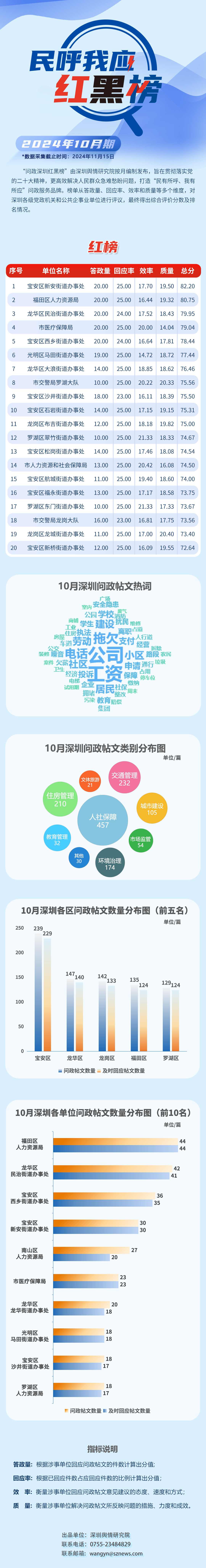 本期榜單采集的帖文主要來自深圳市及各區(qū)政府官網、深圳論壇、人民網領導留言板、深圳新聞網“民呼我應”等平臺,所采集帖文發(fā)布時間為2024年10月1日至10月31日,采集截止時間為2024年11月15日。