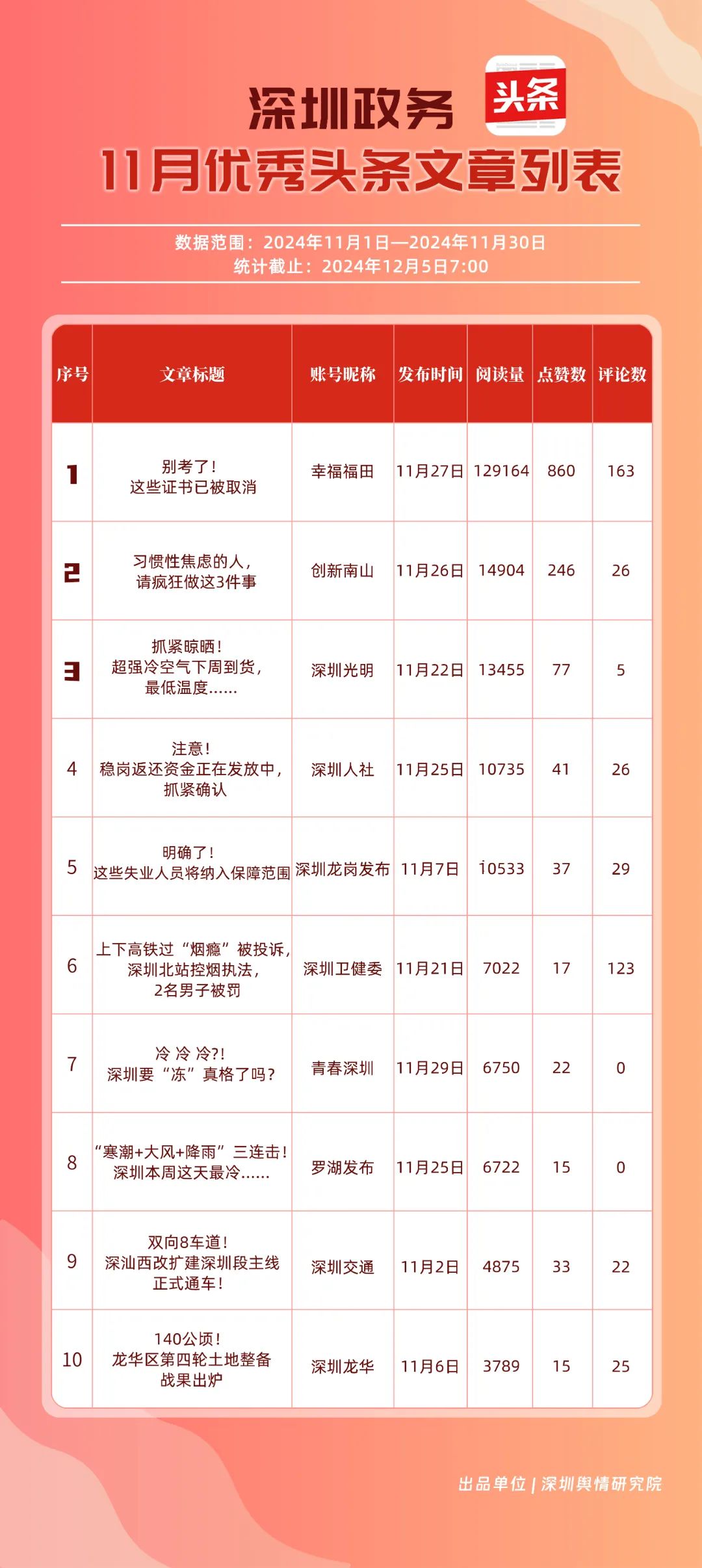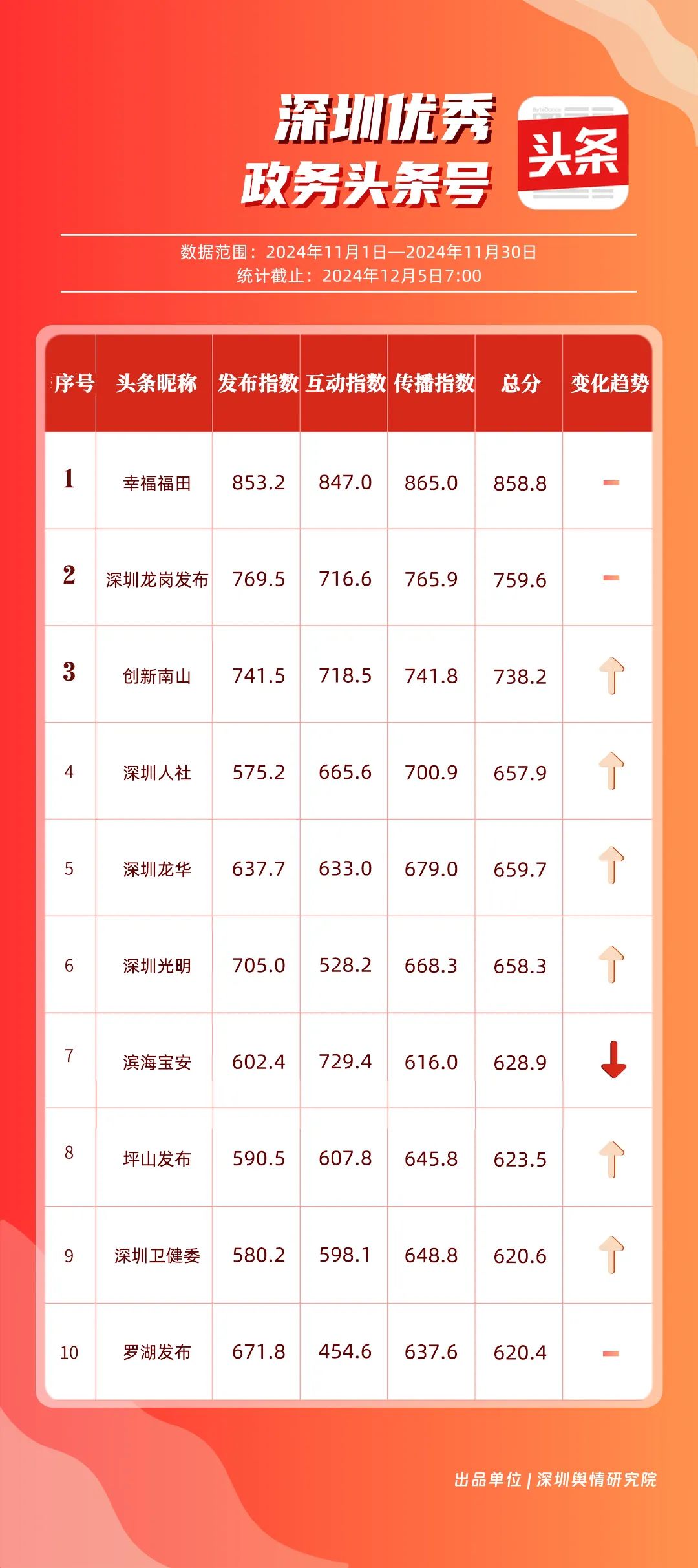 11月,“幸福福田”“深圳龍崗發(fā)布”“創(chuàng)新南山”“深圳人社”“深圳龍華”“深圳光明”“濱海寶安”“坪山發(fā)布”“深圳衛(wèi)健委”“羅湖發(fā)布”共10個政務頭條號入選“優(yōu)秀政務頭條號”榜單?!靶腋8L铩卑l(fā)布大量民生相關(guān)信息,穩(wěn)居第一?!吧钲邶垗彴l(fā)布”同樣表現(xiàn)不凡,排名始終位于前列,展現(xiàn)了其在信息傳播與政務服務方面的卓越能力。此外,賬號“創(chuàng)新南山”“深圳人社”“深圳龍華”“深圳光明”在榜單中的排名有所提升,為政務新媒體樹立了典范。