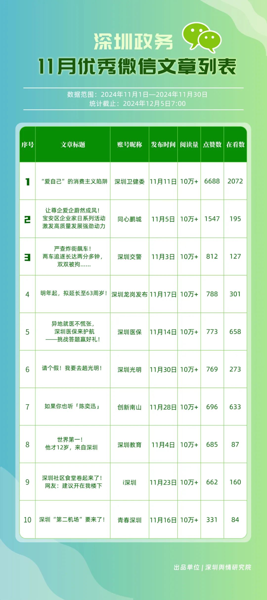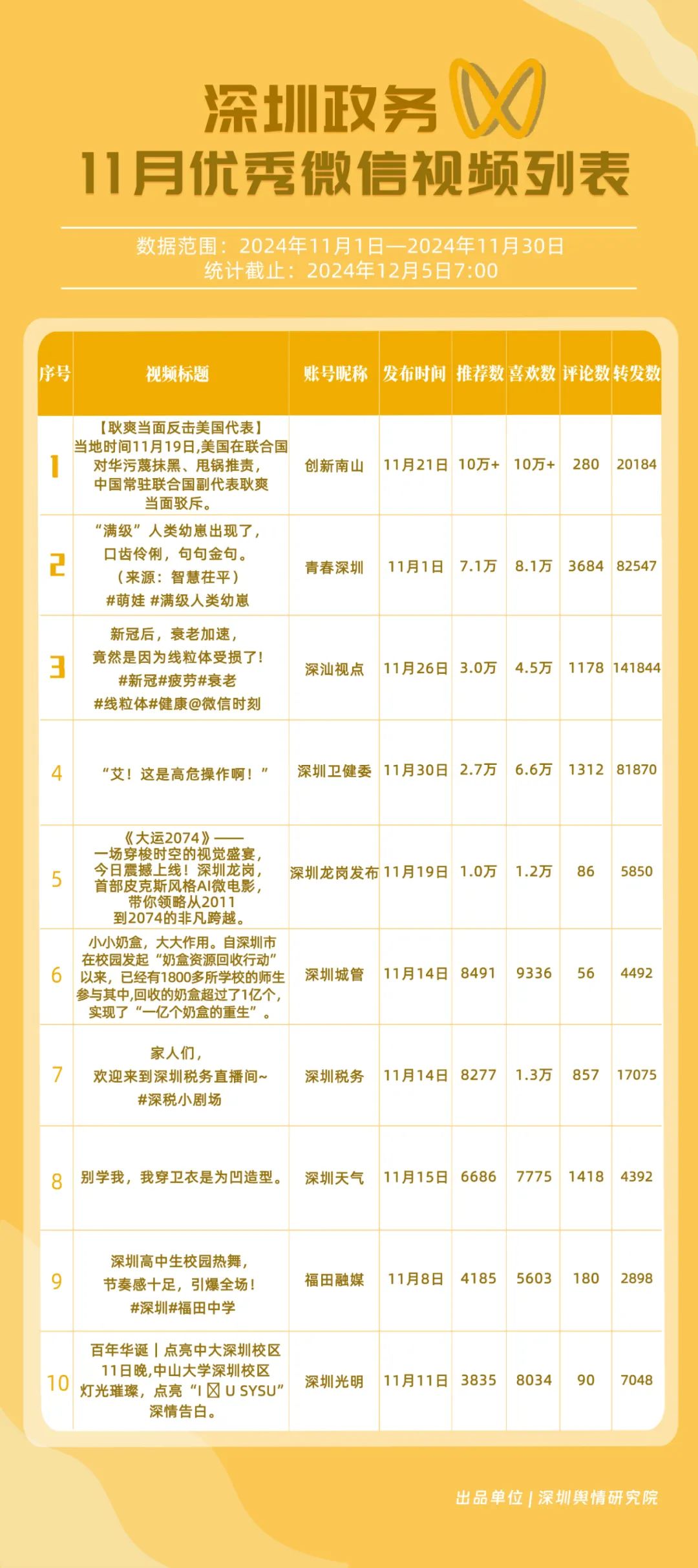 11月,獲“深圳優(yōu)秀政務微信視頻號”稱號的分別是“深汕視點”“青春深圳”“深圳衛(wèi)健委”“創(chuàng)新南山”“深圳龍崗發(fā)布”“福田融媒”“深圳教育”“深圳天氣”“深圳稅務”“深圳光明”。其中,“深汕視點”與“青春深圳”通過積極轉(zhuǎn)發(fā)涵蓋廣泛領(lǐng)域的優(yōu)質(zhì)視頻內(nèi)容,贏得了網(wǎng)民的廣泛點贊與推薦,彰顯了其在內(nèi)容聚合與傳播上的獨到之處。“深圳衛(wèi)健委”則專注于衛(wèi)生健康領(lǐng)域,發(fā)布了一系列高質(zhì)量的內(nèi)容,深受網(wǎng)民喜愛,進一步鞏固了其在健康傳播領(lǐng)域的領(lǐng)先地位。