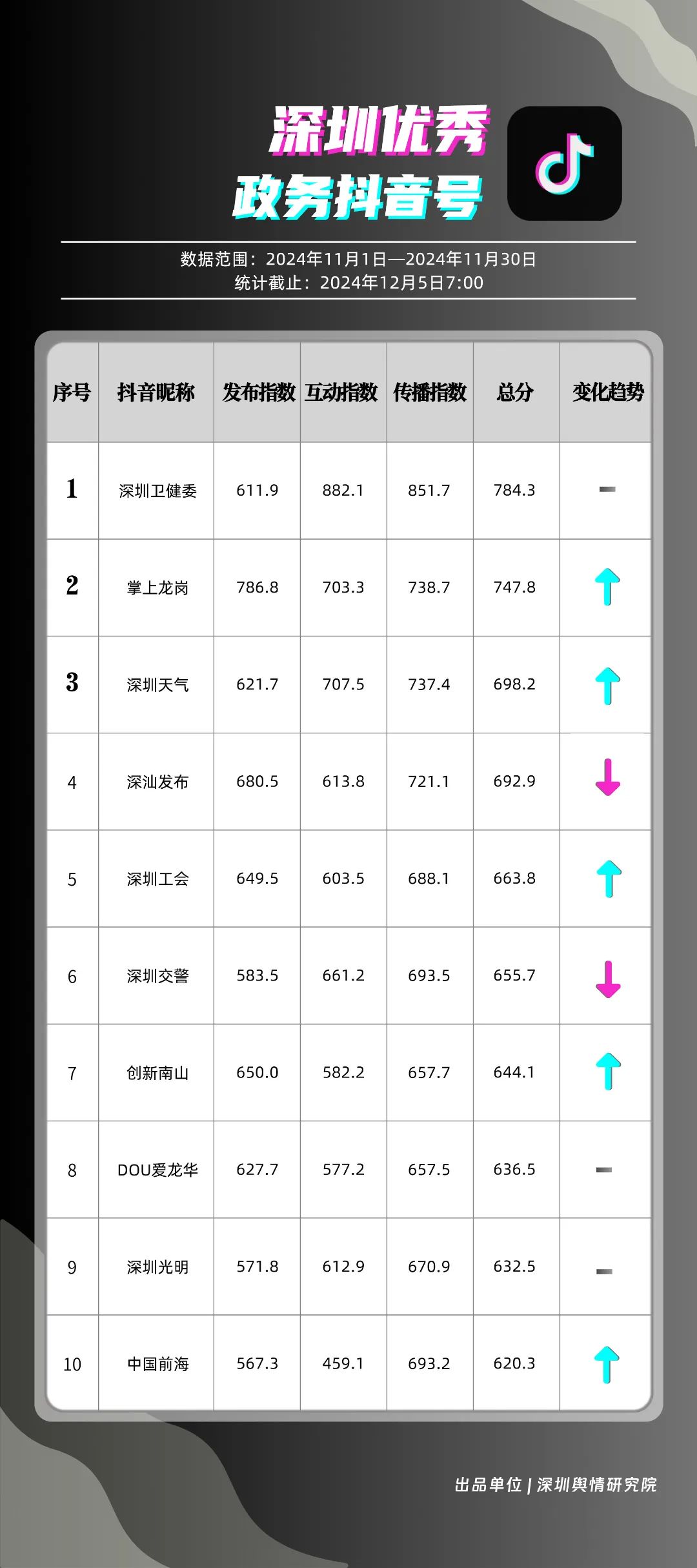 11月,“深圳衛(wèi)健委”“掌上龍崗”“深圳天氣”“深汕發(fā)布”“深圳工會”“深圳交警”“創(chuàng)新南山”“DOU愛龍華”“深圳光明”“中國前?!惫?0個政務抖音號獲得“深圳優(yōu)秀政務抖音號”稱號?!吧钲谛l(wèi)健委”憑借高質(zhì)量劇情內(nèi)容,巧妙融入健康知識,視頻累計收獲近百萬點贊。同時,“掌上龍崗”和“深圳天氣”也在視頻內(nèi)容創(chuàng)新上不斷探索,通過優(yōu)化宣傳策略和信息傳播方式,使得網(wǎng)民能夠在輕松愉快的氛圍中了解龍崗區(qū)的最新動態(tài)和深圳的天氣信息,展現(xiàn)了政務抖音號的獨特魅力與社會影響力。