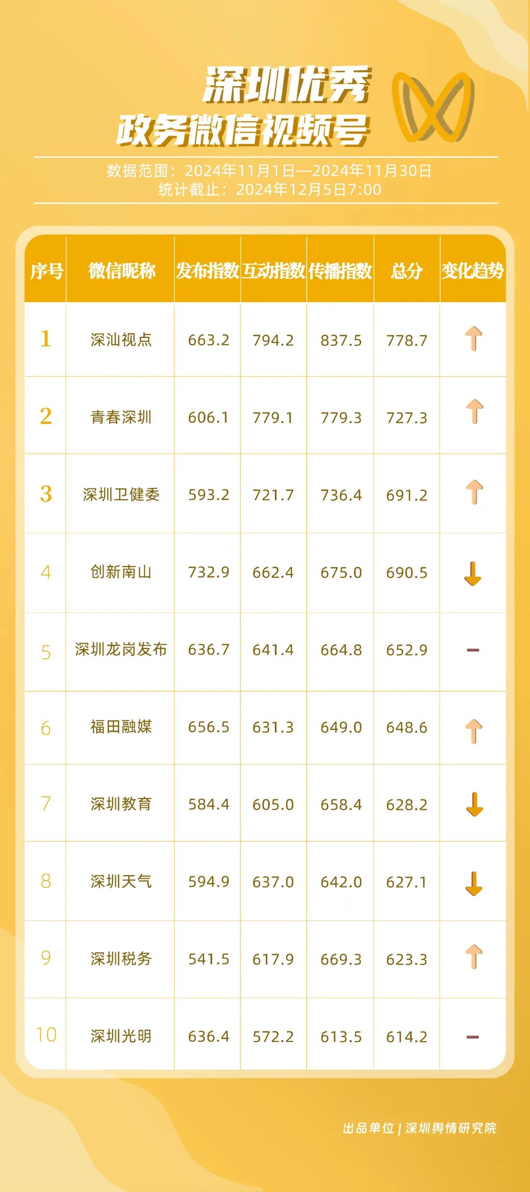 《深圳優(yōu)秀政務新媒體矩陣》2024年11月榜單揭曉,讓我們一同關(guān)注,哪些新媒體矩陣能夠憑借優(yōu)異表現(xiàn)嶄露新姿,成為加速政務傳播與服務創(chuàng)新發(fā)展的先鋒。