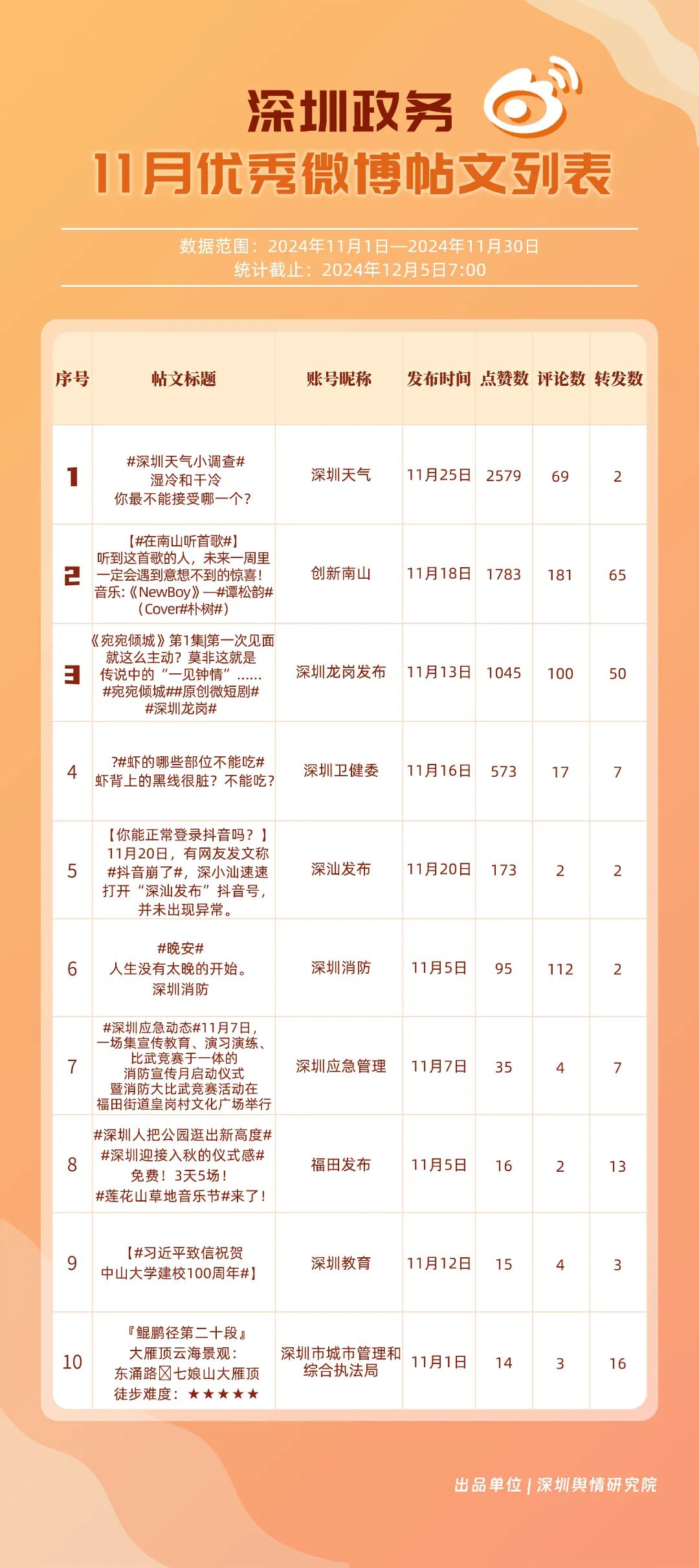 11月,“深圳天氣”“深圳衛(wèi)健委”“深圳龍崗發(fā)布”“深圳消防”“創(chuàng)新南山”“深圳應急管理”“深圳公安”“深圳市城市管理和綜合執(zhí)法局”“福田發(fā)布”“深圳交警”等20個賬號入選“優(yōu)秀政務微博號”?!吧钲谔鞖狻薄吧钲谛l(wèi)健委”賬號在信息傳播上不斷精進,為市民帶來及時、優(yōu)質(zhì)且高效的資訊,內(nèi)容緊貼民生,贏得了市民的廣泛贊譽,排名穩(wěn)定在前2名。同時,“深圳龍崗發(fā)布”“深圳消防”和“創(chuàng)新南山”等賬號也能夠精準滿足市民的信息需求,并在此基礎上提升市民閱讀體驗,推動了其在榜單上的穩(wěn)步提升,彰顯了政務微博的創(chuàng)新活力與社會價值。