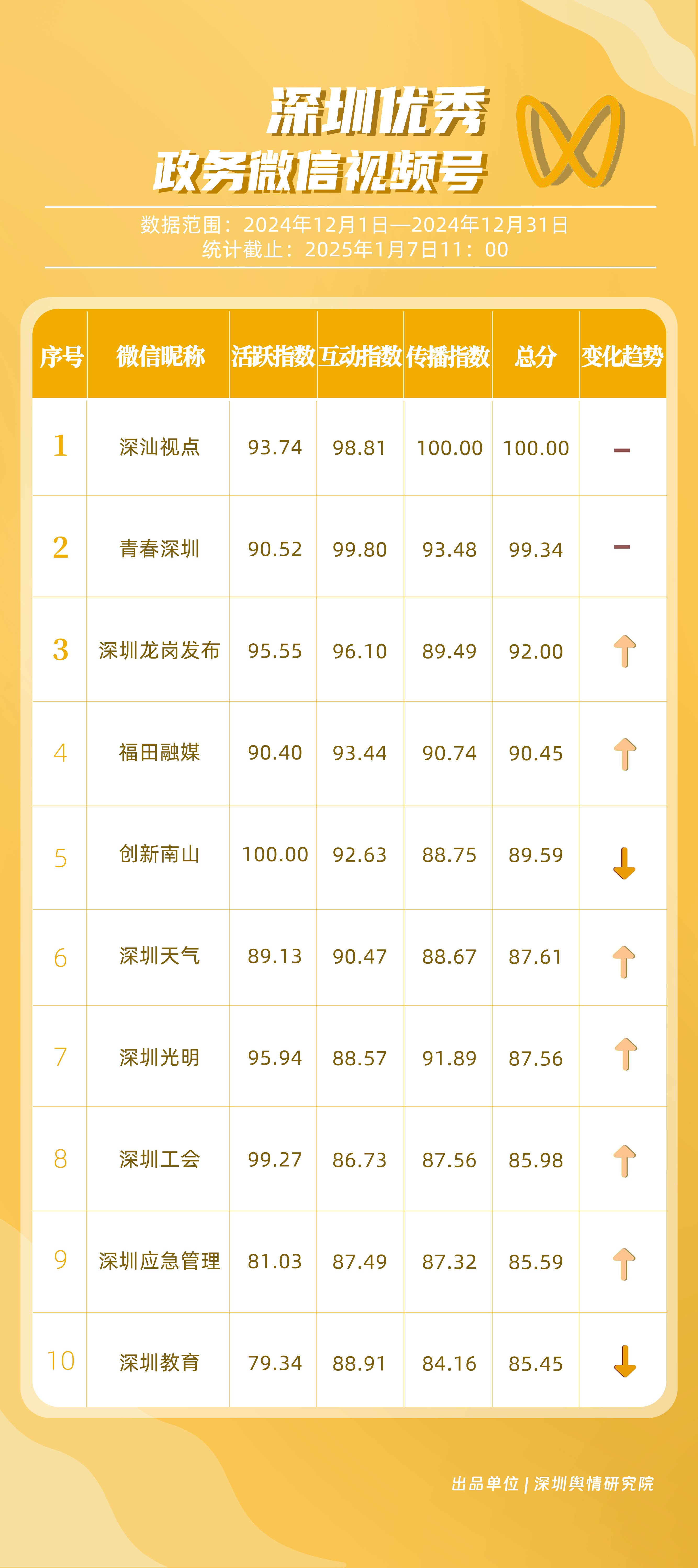 12月,獲“深圳優(yōu)秀政務(wù)微信視頻號(hào)”稱號(hào)的分別是“深汕視點(diǎn)”“青春深圳”“深圳龍崗發(fā)布”“福田融媒”“創(chuàng)新南山”“深圳天氣”“深圳光明”“深圳工會(huì)”“深圳應(yīng)急管理”“深圳教育”。其中,“深汕視點(diǎn)”“青春深圳”在互動(dòng)方面表現(xiàn)突出,占據(jù)榜單第一、第二位置?!吧钲邶垗彴l(fā)布”活躍、互動(dòng)指數(shù)位于各政務(wù)視頻號(hào)前列,排名有所提升?!案L锶诿健比笾笜?biāo)得分均在90分以上,位于榜單第四名,充分展現(xiàn)各政務(wù)微信視頻號(hào)在信息更新、用戶互動(dòng)以及傳播范圍等方面的卓越能力和持續(xù)進(jìn)步。